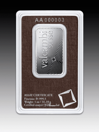 Step into a world of precious metal excellence with this 1oz Valcambi platinum minted bar, struck in Switzerland from 999.5 fine platinum. Its sleek, gleaming finish and precise Valcambi logo on the obverse deliver both visual sophistication and trustworthy authenticity. Designed for both collectors and investors, this bar’s compact 1oz size makes it a versatile choice for diversifying your precious metals portfolio, complementing gold and silver assets.
