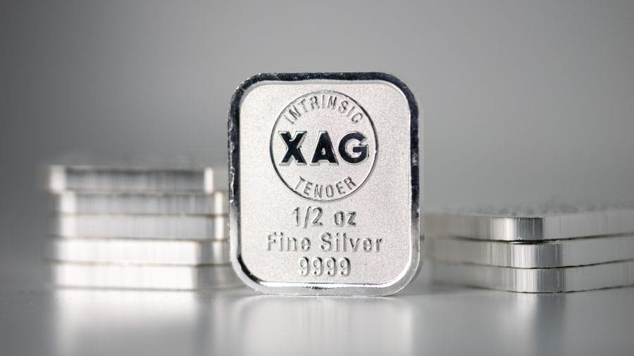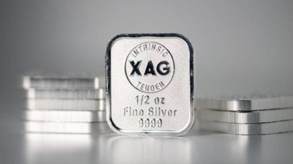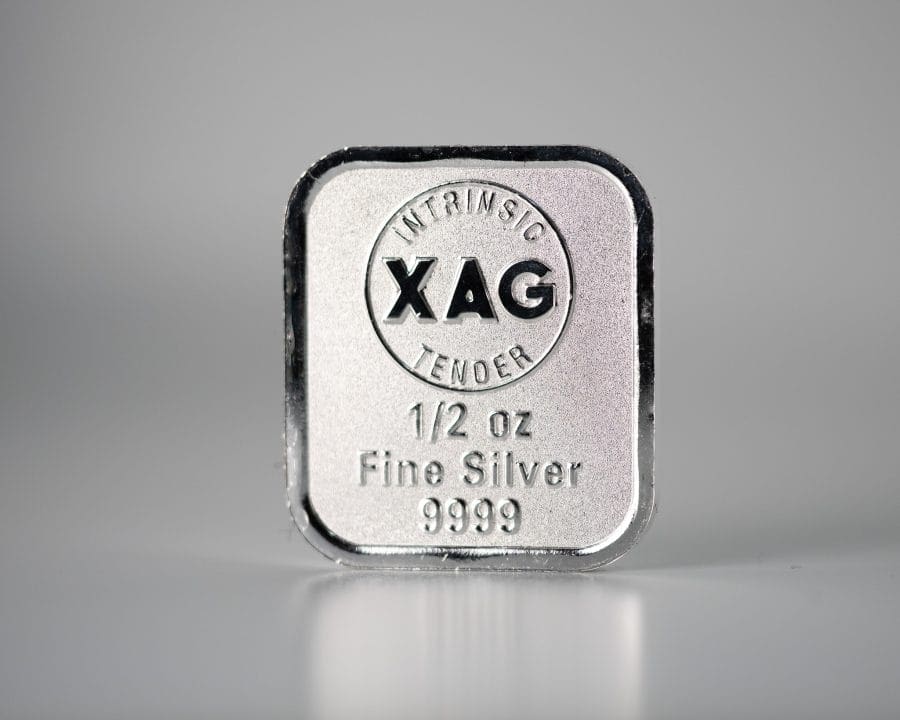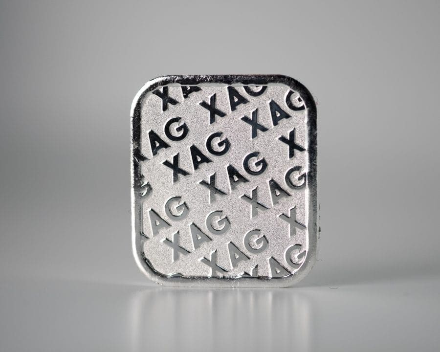 Produced in Australia, this silver cast bar contains 5 troy ounces of .9999 fine silver. The 5 oz XAG silver bullion cast bar is stamped with “XAG”, “1/2 oz” and “9999”.