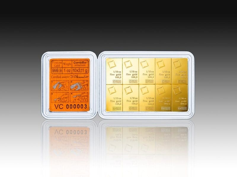 Admire Swiss precision with this Valcambi 1oz Gold CombiBar, designed for both secure investment and practical utility. Each CombiBar comprises one troy ounce of 999.9 fine gold, uniquely crafted so it can be easily divided into ten 1-gram or ten 10-gram sections without losing value or purity. Its ingenious splittable design is ideal for those seeking flexibility in their precious metals portfolio or gifting options. The shimmering finish imbues each piece with the lustre you expect from world-renowned Swiss gold.