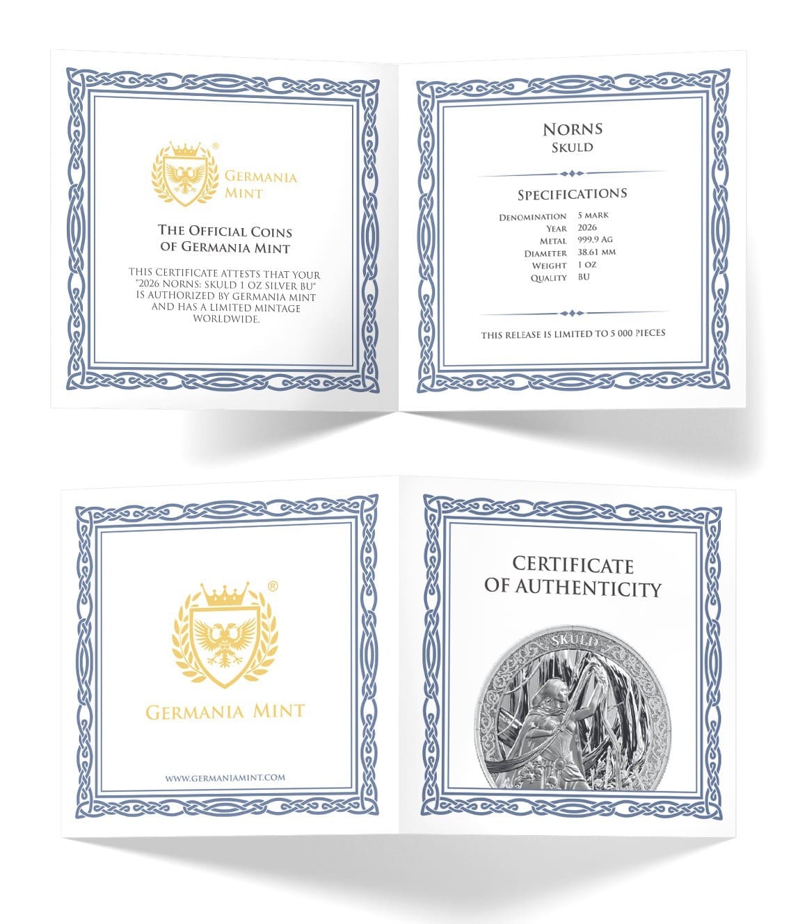 Immerse yourself in the captivating artistry of the Norns Skuld 1oz silver BU coin, expertly struck by Germania Mint for 2026. Showcasing the mythical Norn Skuld, guardian of destiny in Norse legend, this beautifully detailed piece fuses ancient lore with contemporary minting brilliance. The coin features a lustrous brilliant uncirculated finish on 999.9 fine silver, making it a standout for both investors and mythology enthusiasts. With limited mintage and the trusted craftsmanship of Germania Mint, this collectable fits perfectly into any discerning numismatic collection.