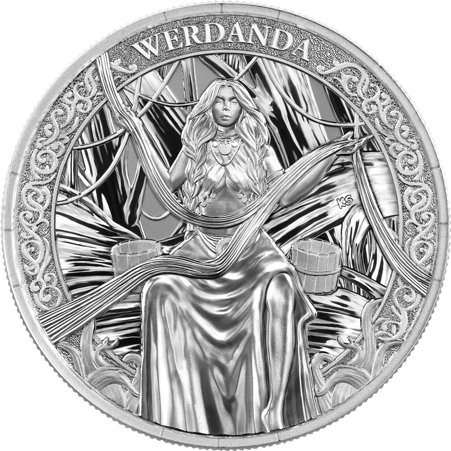 This stunning 1 ounce silver BU coin from Germania Mint features Werdanda, one of the revered Norns of Norse mythology, captured in brilliant uncirculated finish. The Germania Mint excels in intricate designs, and this silver piece is no exception — Werdanda is depicted with exquisite detail, celebrating destiny and fate through ancient storytelling motifs. Made from pure silver, this collectable coin radiates quality and offers a sought-after combination of artistry and investment potential to add to your growing numismatic collection.