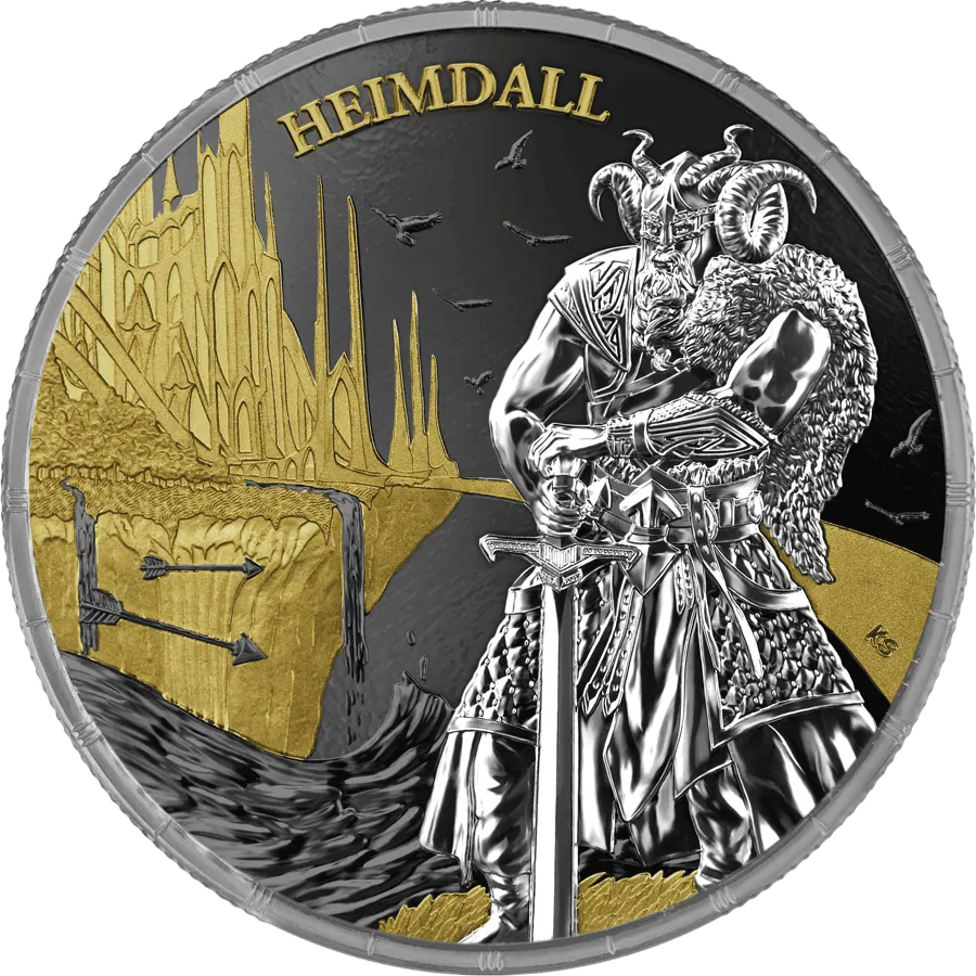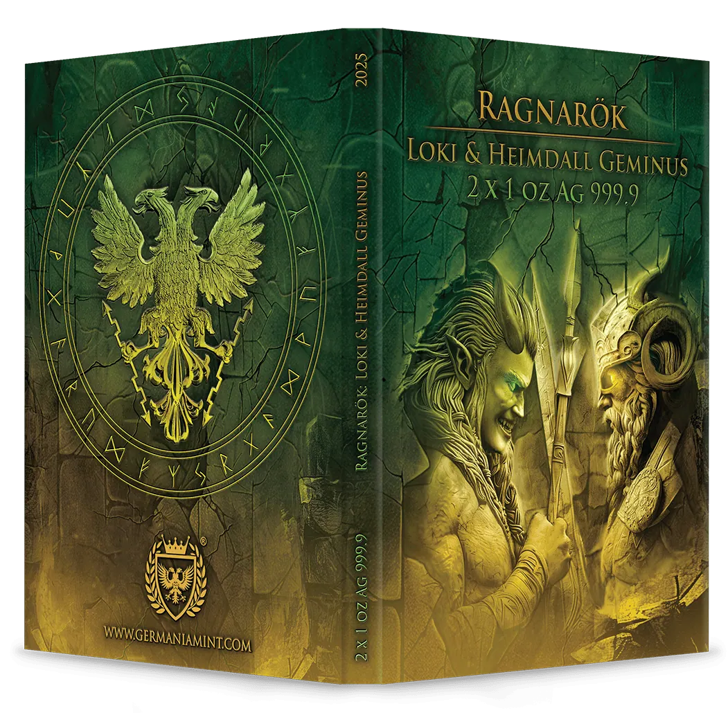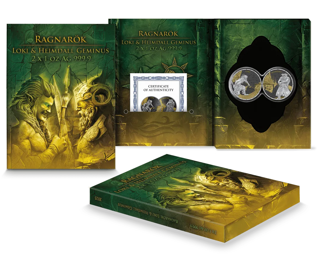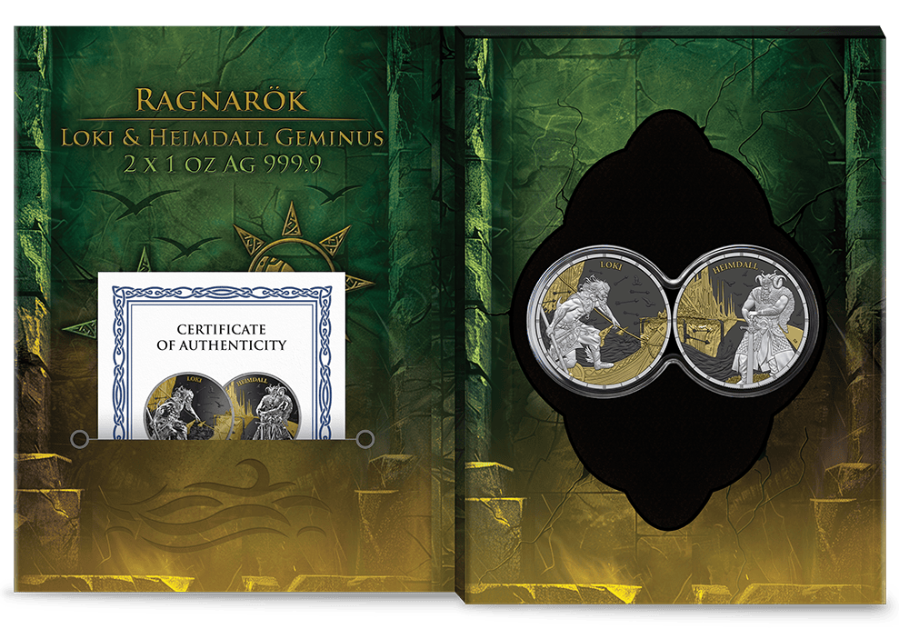 Unleash the drama of Norse legend with this exquisite pair of 2025 Germania silver coins, showcasing both Loki and Heimdall in a captivating Geminus design. Crafted by Germania Mint with just 500 sets worldwide, each coin is struck from 1 oz of .9999 pure silver, featuring a stunning blend of gold gilding and rich black ruthenium. When placed together, the mirrored artwork forms an epic battle scene, perfectly capturing the mythic clash from Ragnarok. Each 38.61 mm coin is presented in a collector’s blisterpack with its matching capsule and certificate of authenticity for unrivalled display and security.