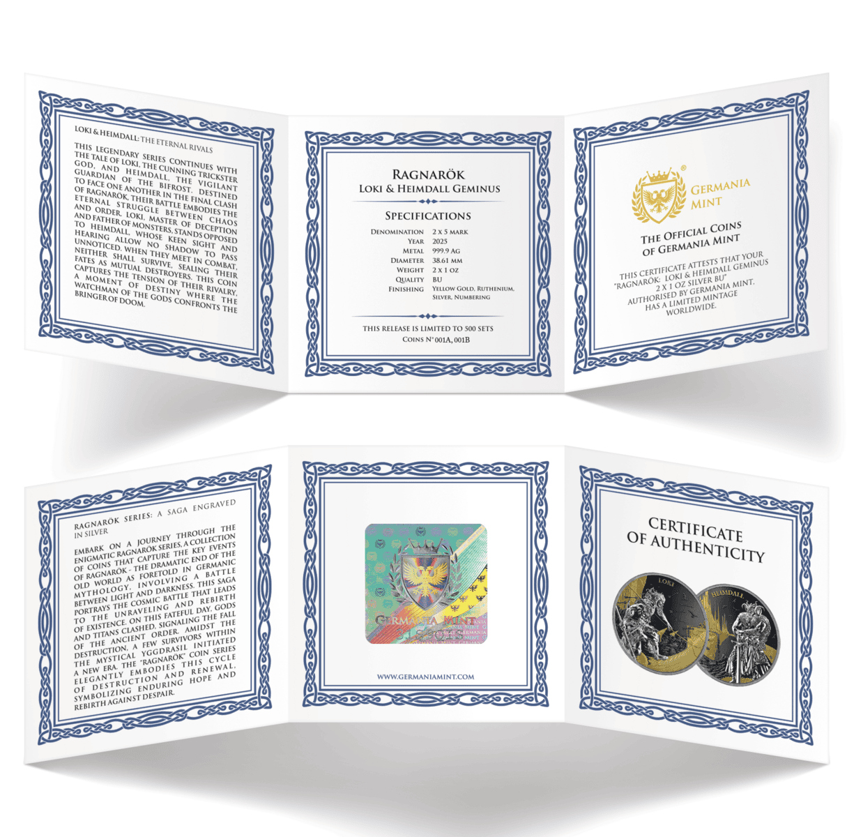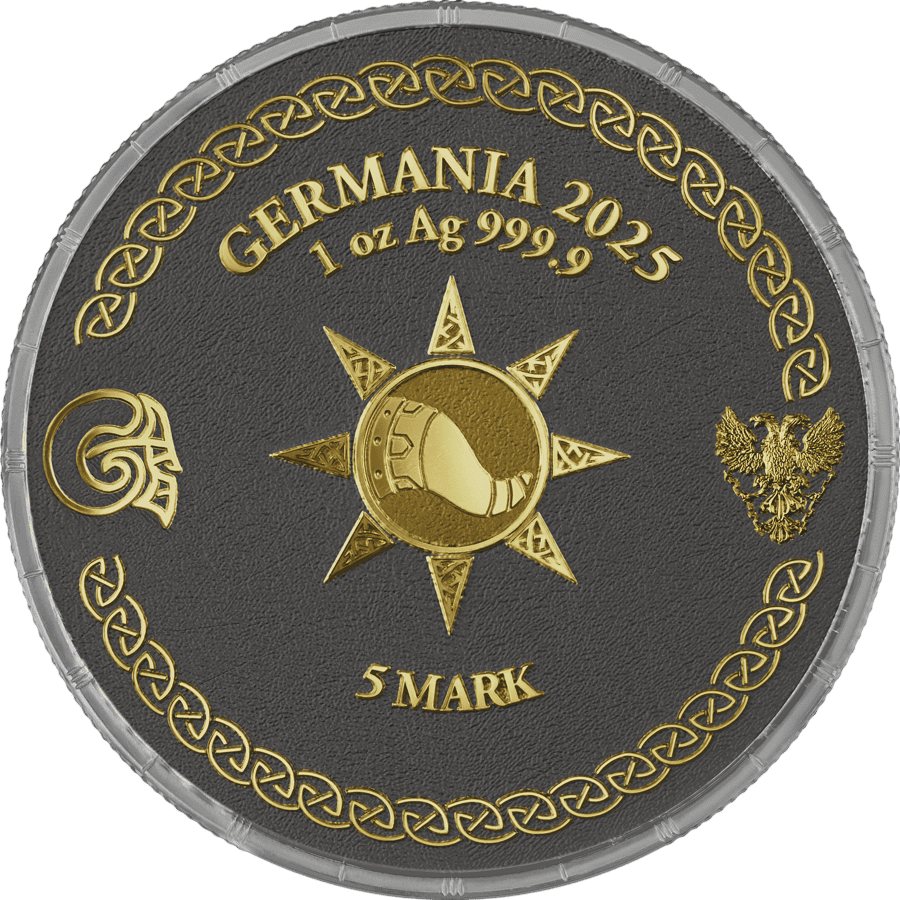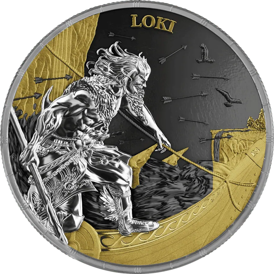 Unleash the drama of Norse legend with this exquisite pair of 2025 Germania silver coins, showcasing both Loki and Heimdall in a captivating Geminus design. Crafted by Germania Mint with just 500 sets worldwide, each coin is struck from 1 oz of .9999 pure silver, featuring a stunning blend of gold gilding and rich black ruthenium. When placed together, the mirrored artwork forms an epic battle scene, perfectly capturing the mythic clash from Ragnarok. Each 38.61 mm coin is presented in a collector’s blisterpack with its matching capsule and certificate of authenticity for unrivalled display and security.