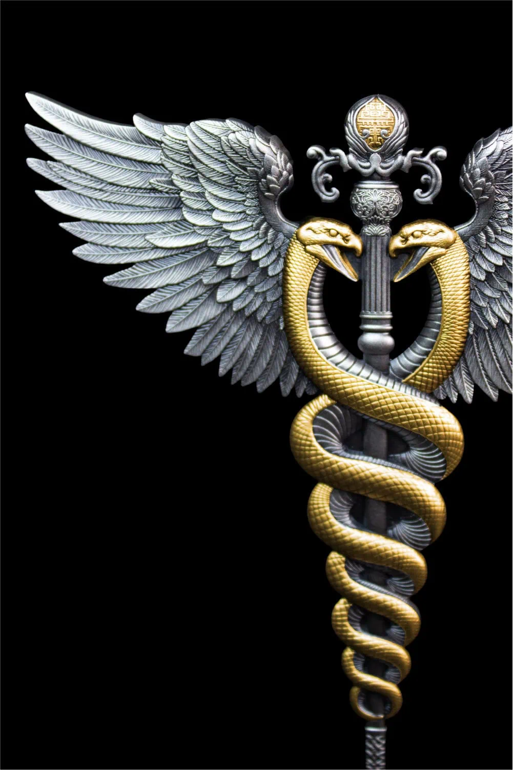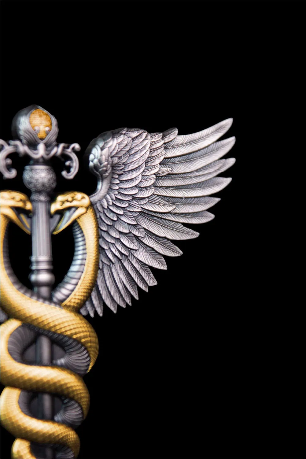 Step into the world of numismatic excellence with this stunning 2.5 oz silver gilded masterpiece inspired by South Korea’s mythical treasures. This staff brings together two sculpted serpents elegantly coiled around a gilded winged staff, symbolising wisdom and healing. The high relief finish, combined with partial gilding, creates a vibrant contrast between pure silver and shimmering gold hues, setting this collectible apart as a radiant showpiece.