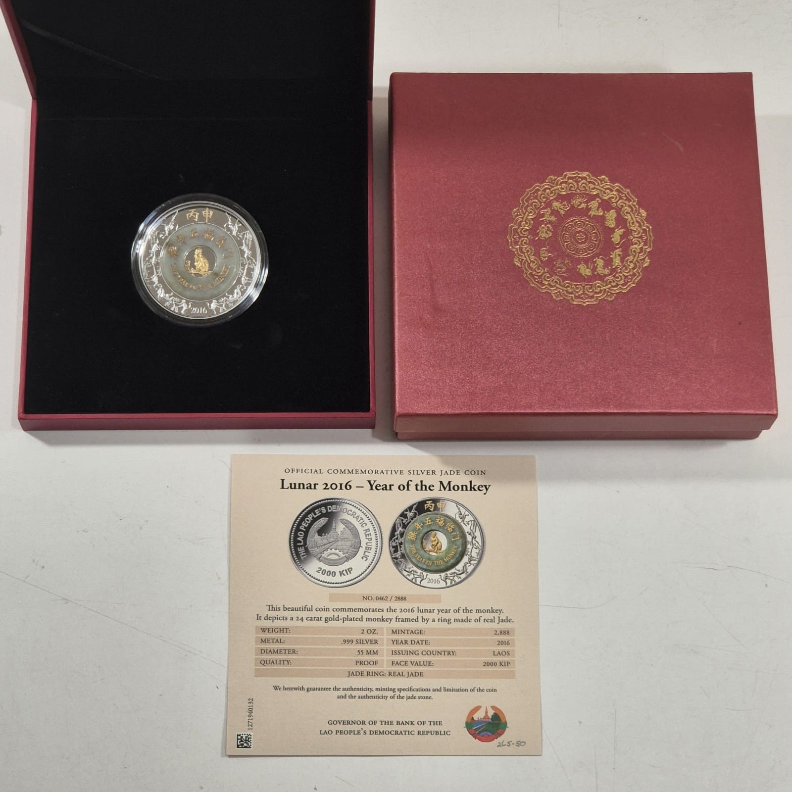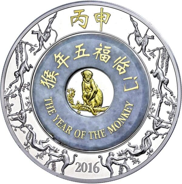 Celebrate 2016’s Lunar Year of the Monkey with this breathtaking 2oz silver coin, expertly crafted in proof quality and featuring a unique jade inlay. Gilded accents highlight the detailed design, showcasing the agile monkey, a symbol of intelligence and resourcefulness. The distinguished finish and limited mintage make this 2000 Lao Kip coin an alluring centrepiece for both experienced collectors and those new to numismatics.