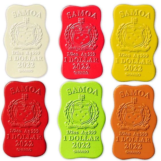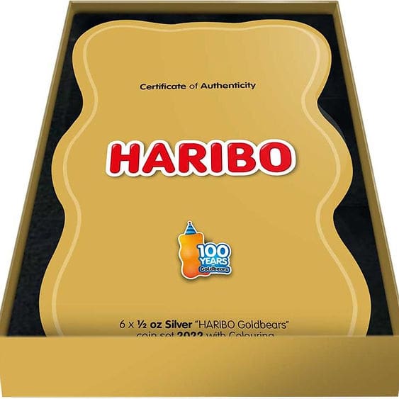 Dive into nostalgia and delight with this vibrant six piece set, featuring three dimensional coloured silver coins shaped just like the classic Haribo Goldbears. Strikingly finished in vivid hues, each $1 coin is crafted from 1/2 oz of fine 999 silver, perfect for collectors who appreciate playful artistry and high quality minting. The set marks the 100th anniversary of the world famous confection, presenting an eye catching addition to any collection or an uplifting gift for fans of both numismatics and iconic treats.