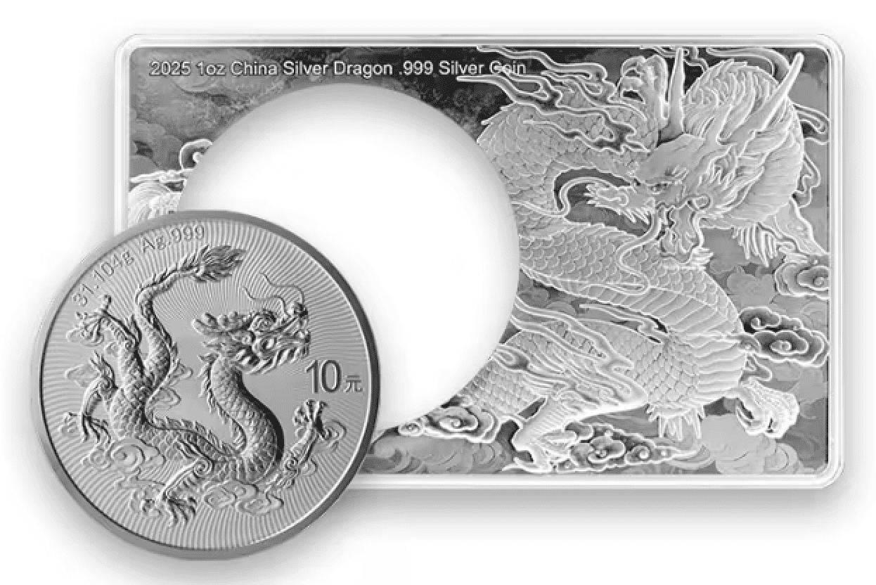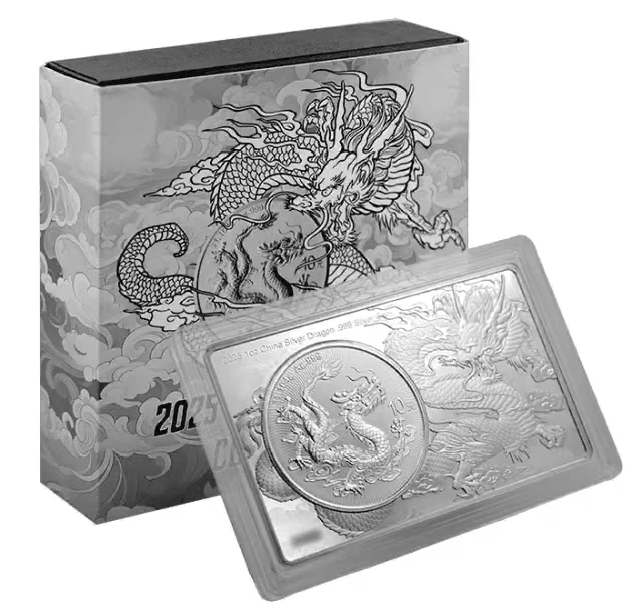 Immerse yourself in Chinese heritage and artistry with this stunning 2025 3oz China Dragon .999 Silver Coin in Bar. This highly anticipated release unites a beautifully detailed 1oz coin—featuring a dynamic, coiled dragon—with a striking 2oz silver bar, showcasing a legendary dragon in proud relief. The obverse seamlessly displays a breathtaking Great Wall panorama, bridging the coin and bar for a cohesive, collectible masterpiece. Struck in fine .999 silver, every aspect reflects meticulous craftsmanship and the enduring appeal of dragon symbolism.