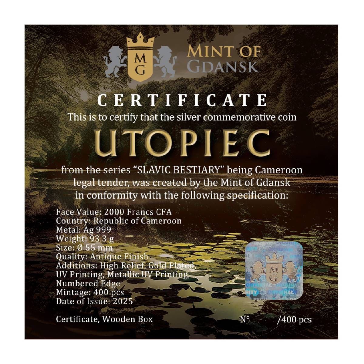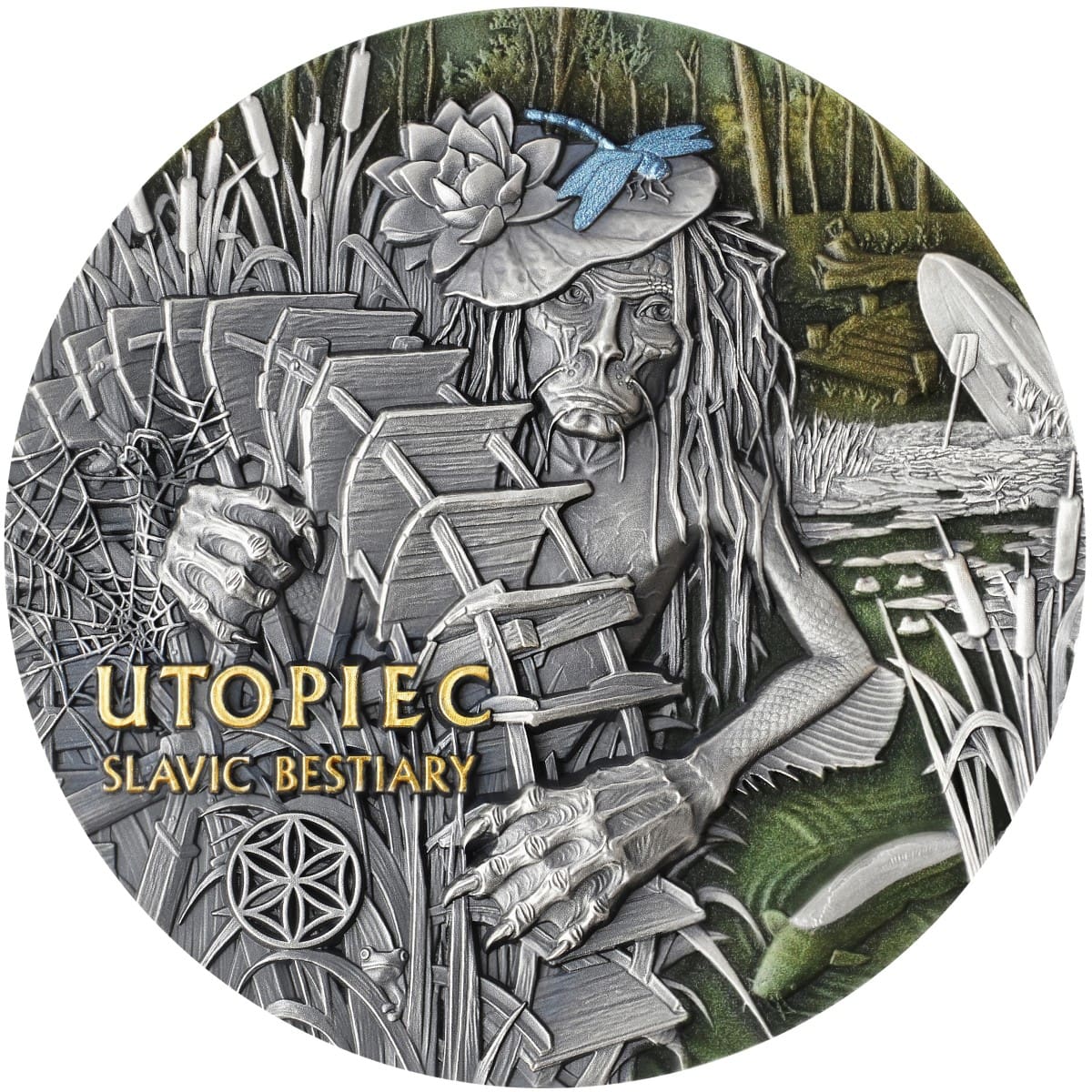 Step into the mysterious world of Slavic folklore with this stunning 2024 Utopiec Slavic Bestiary 3oz silver coin. Crafted in high relief and finished with an antiqued touch, this collectable showcases the legendary Utopiec spirit in breathtaking detail. Struck from pure silver, the heavy 3oz weight and meticulous artistry bring the mythical creature to life, making it a standout piece for any enthusiast of mythology, rare silver coins or themed treasures.