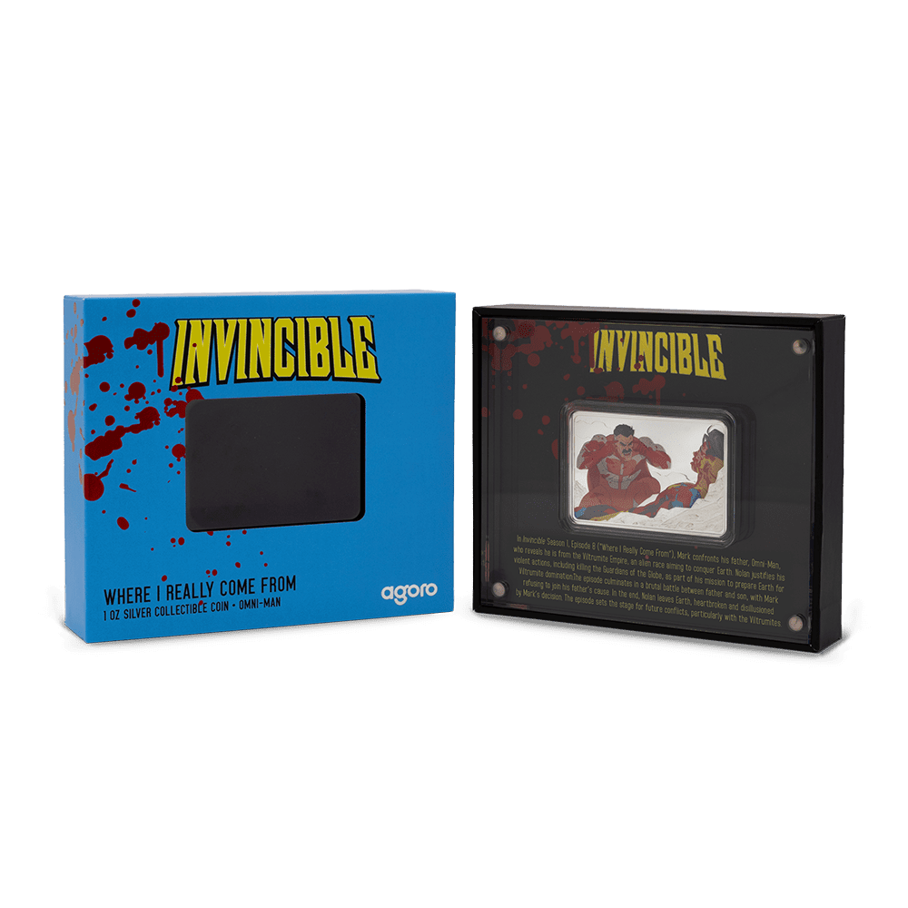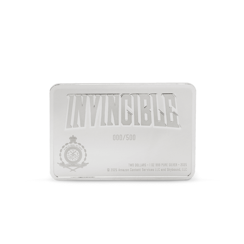 This rectangular coin features a frosted mountain backdrop, high-contrast mirror finish, and individually numbered obverse. A powerful piece for *Invincible* fans and serious collectors alike, each coin is presented in an acrylic display block with a Certificate of Authenticity. Secure this limited release before it vanishes into legend.