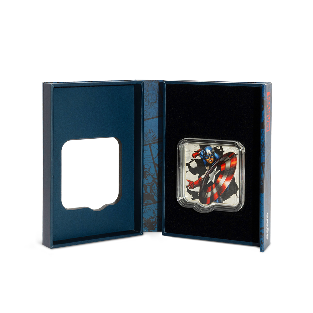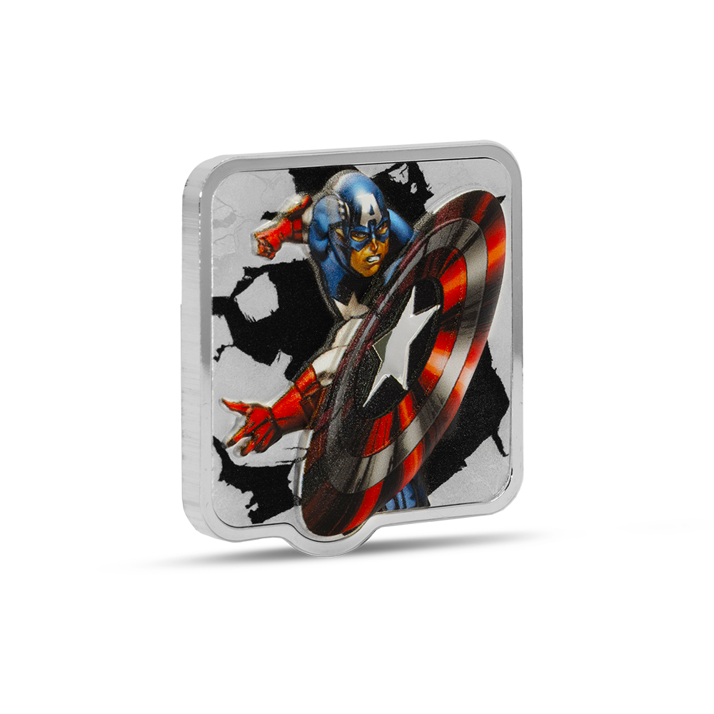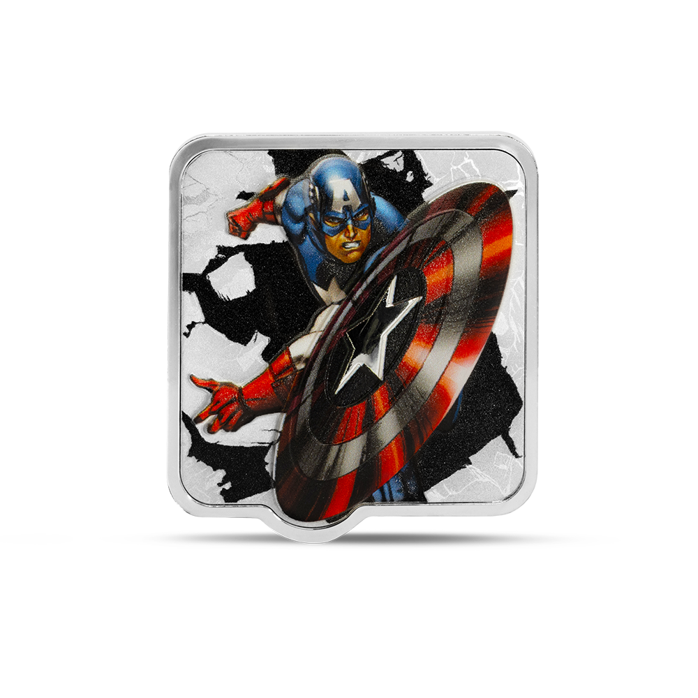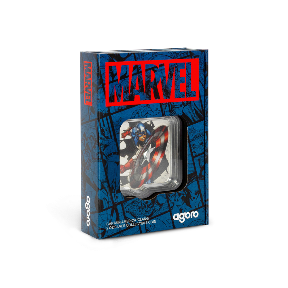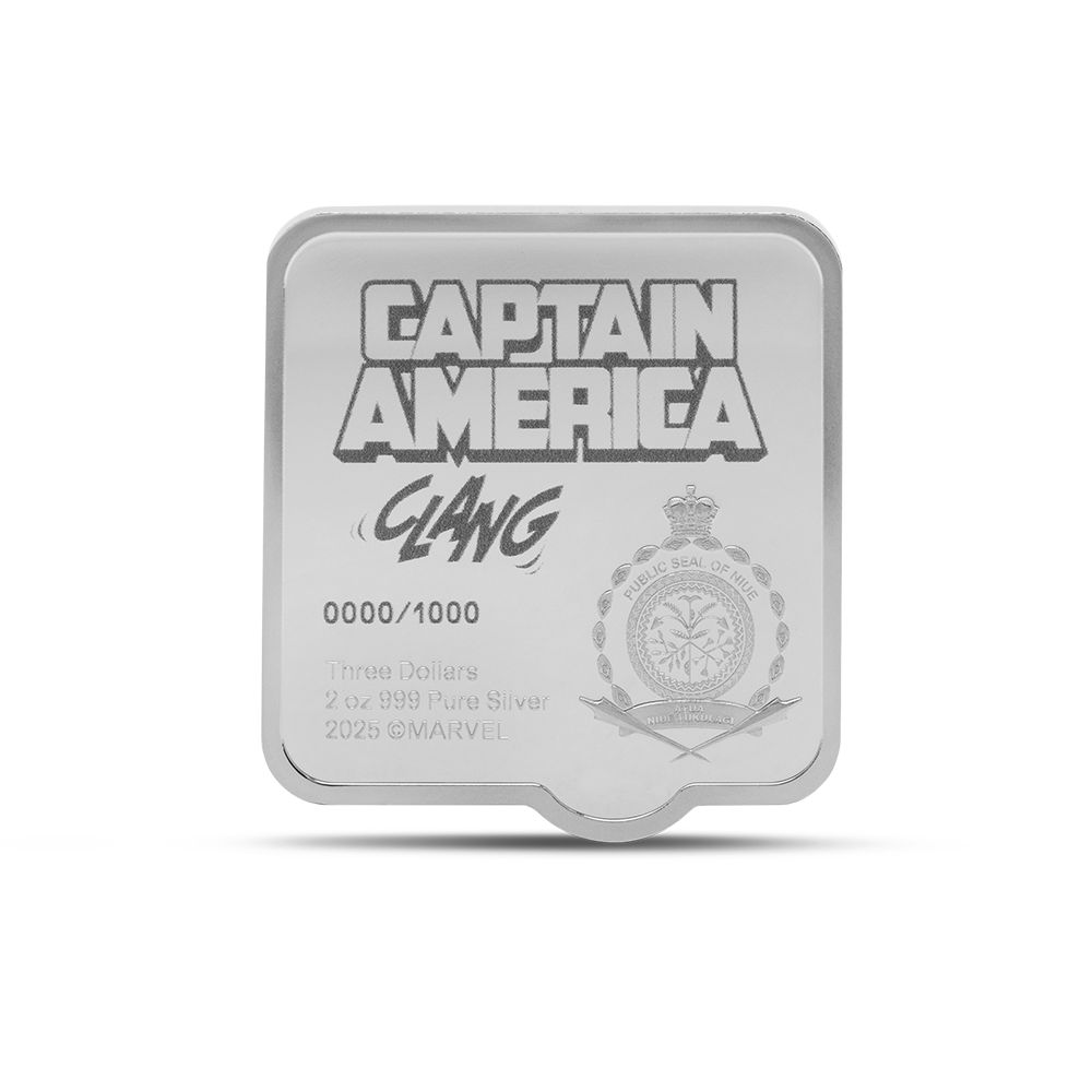 This 2025 $3 Marvel Captain America ‘Clang’ 2oz Silver Niue coin captures the heroic moment of impact as Captain America launches his iconic vibranium shield, brought to life in stunning ultra high relief. Crafted from 2oz of 999 pure silver with brilliant spot-colour detailing, the design draws inspiration from classic comic art, where the bold colours of your Marvel hero pop against an engraved, monochrome backdrop. With a proof finish, mirror-like obverse featuring the Public Seal of Niue, and striking packaging, every element celebrates this collector piece’s premium quality.