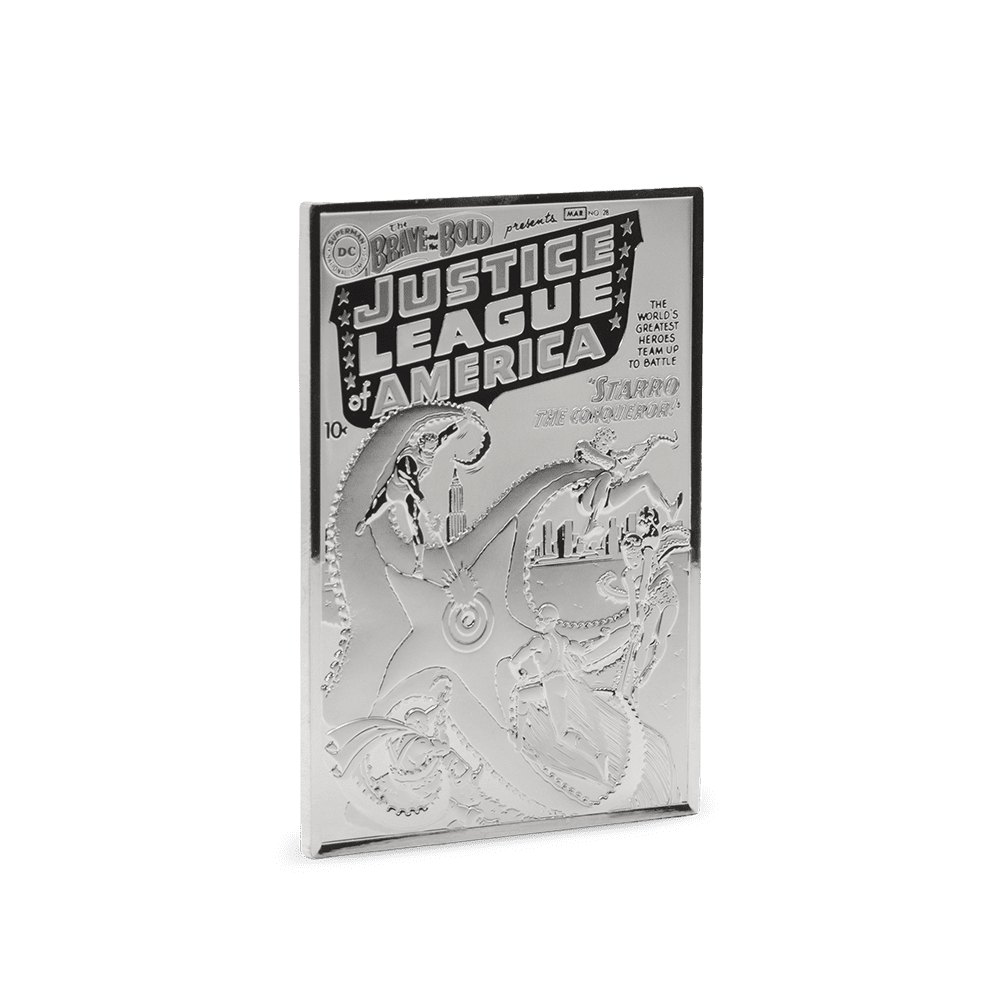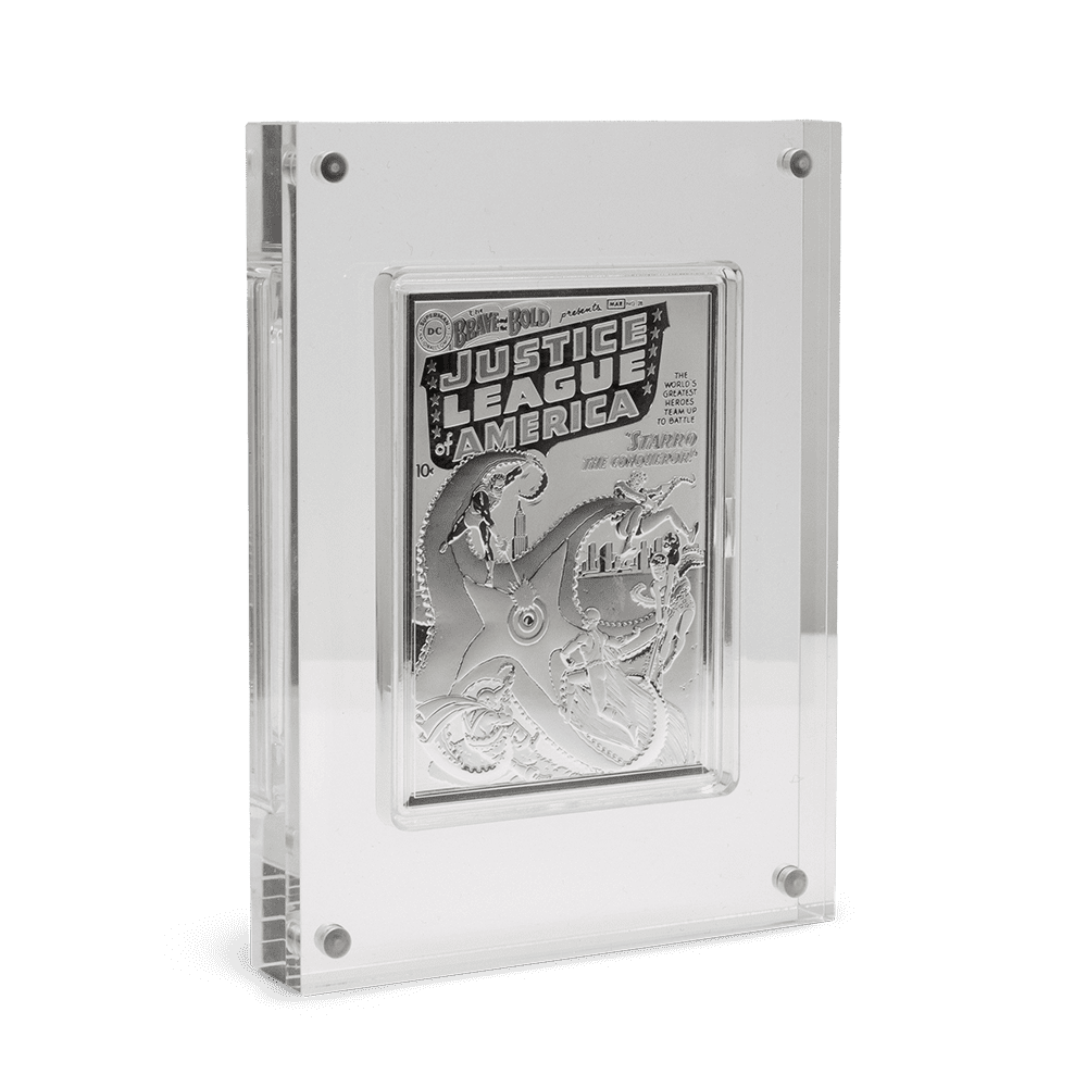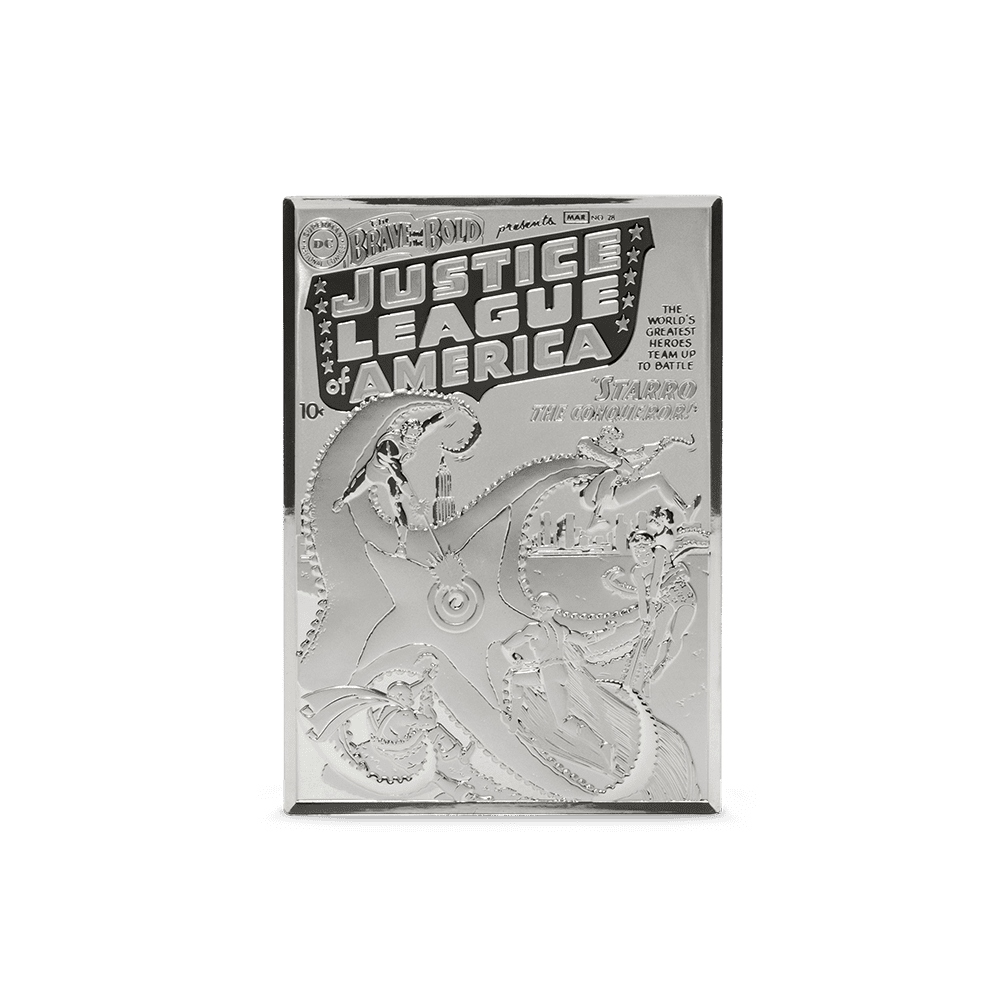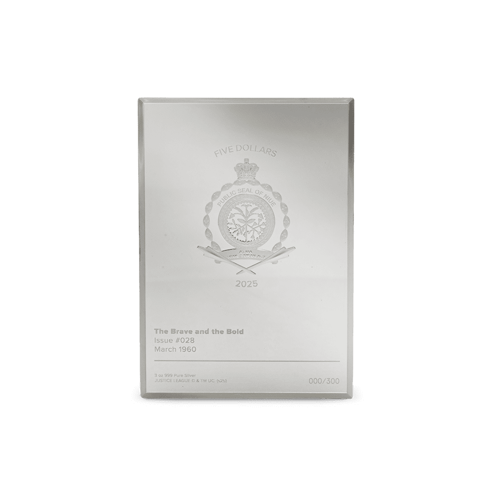 Step into the iconic Silver Age with this premium 2025 $5 3oz silver proof coin, honouring the 90th Anniversary of DC Comics and the debut of the Justice League in The Brave and the Bold #28. Struck in 3oz of 999 pure silver and officially licensed by DC, this spectacular collectible recreates the classic comic cover featuring Superman, Batman, Wonder Woman, Flash, Green Lantern, Aquaman, and Martian Manhunter united against Starro. Presented in crystal-clear acrylic with themed packaging and Certificate of Authenticity, each coin showcases a proof finish and individually numbered edge—yours could be one of only 300 worldwide.