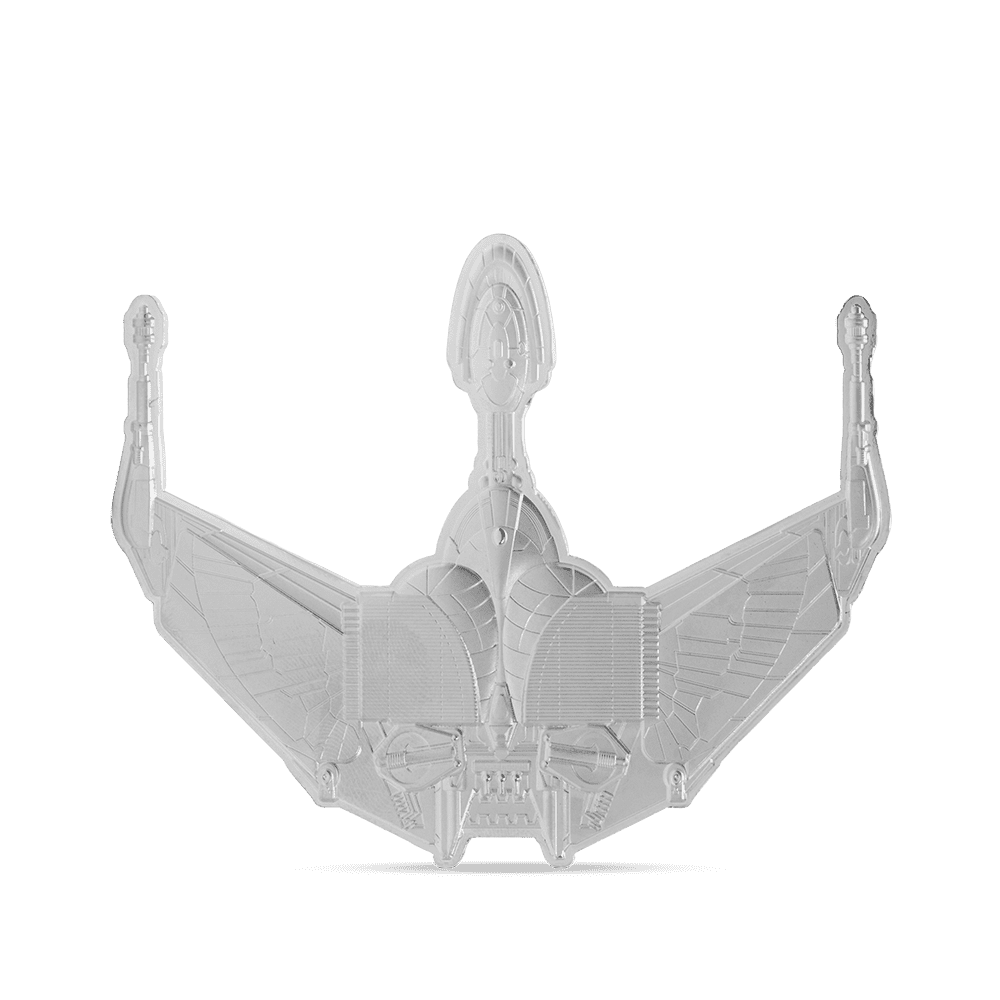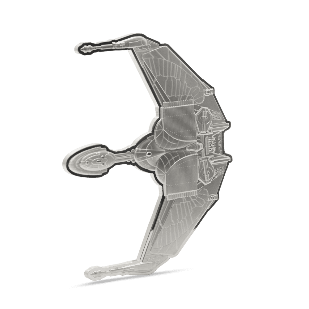 Enter the Star Trek universe with this spectacular $5 silver proof coin, featuring the formidable Klingon Bird-of-Prey in full battle stance. Precision-struck from 3oz of 999 fine silver, each detail of the iconic ship is highlighted by medium frosted finishes and a brilliant mirrored background, making it a must for fans and serious collectors. With only 500 minted worldwide, the rarity and craftsmanship shine through each fully engraved piece, and the legal tender status is certified with the Niue public seal on the obverse.