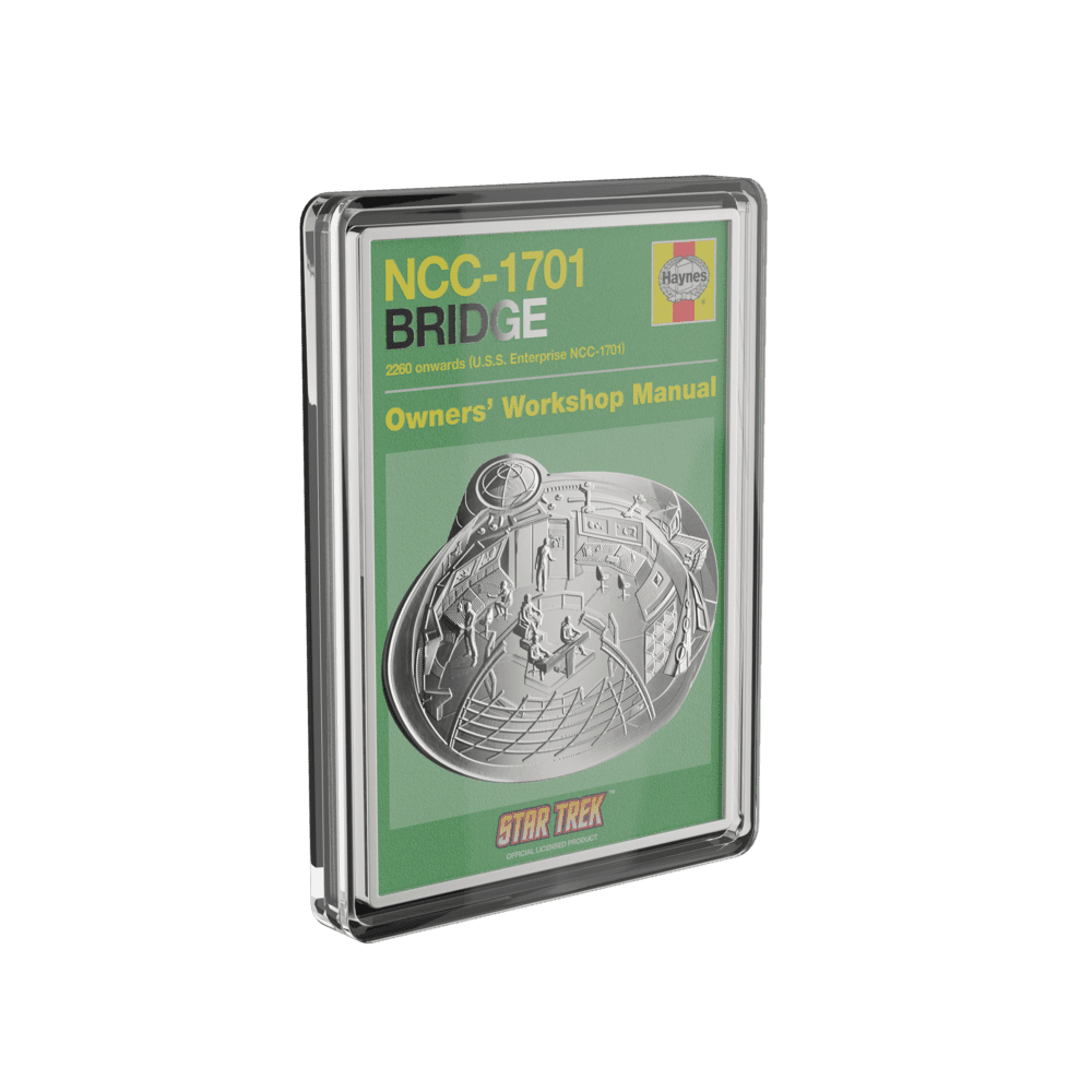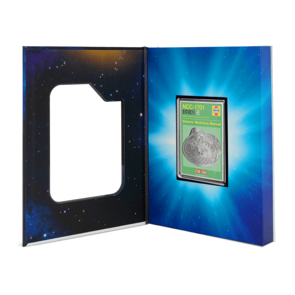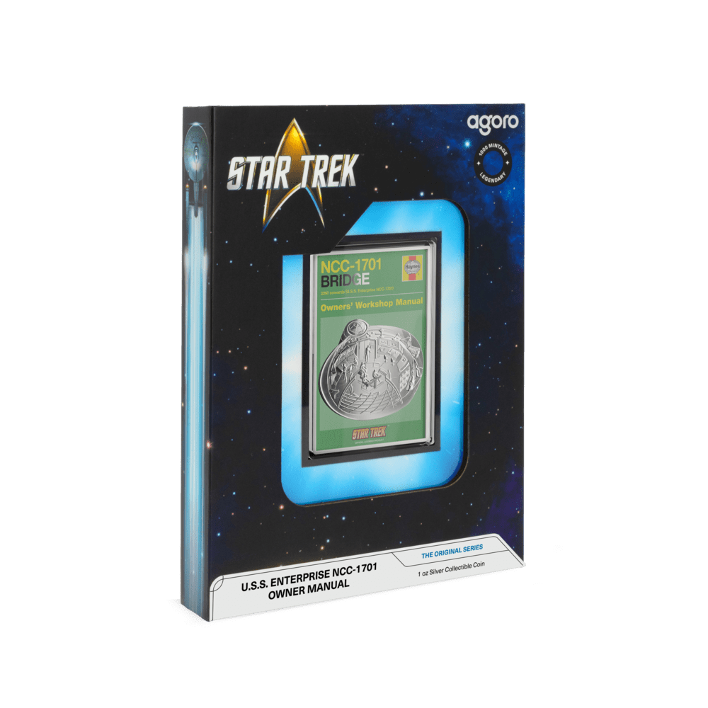 This striking 2025 $2 silver proof coin captures the iconic U.S.S. Enterprise NCC-1701 Bridge in vivid colour, styled as the retro Star Trek Owners’ Workshop Manual. Struck from 1oz of 999 fine silver, the coin’s detailed proof finish and officially licensed design make it a must-have for any Star Trek or sci-fi collector. With a strictly limited mintage of only 1,000, each collectible features its unique engraved number, the Seal of the United Federation of Planets, and is legal tender for Niue.