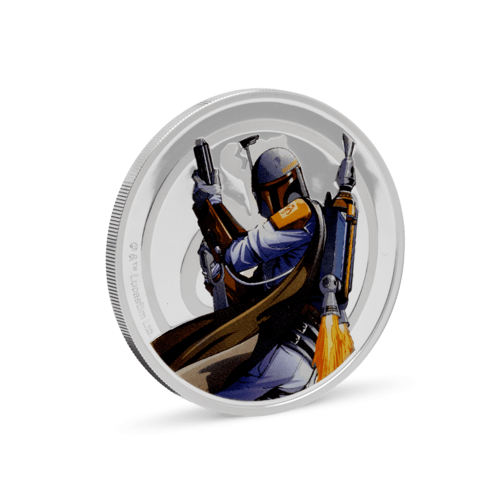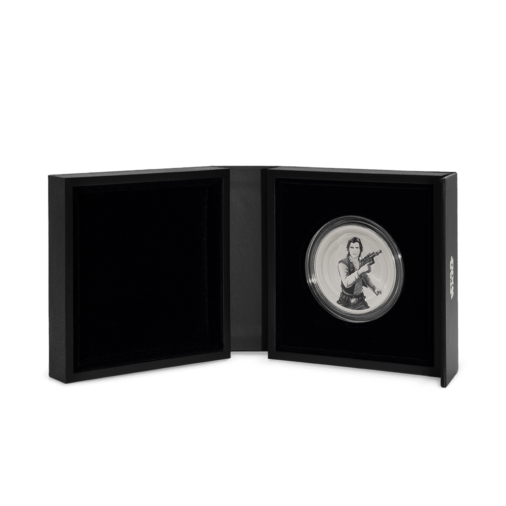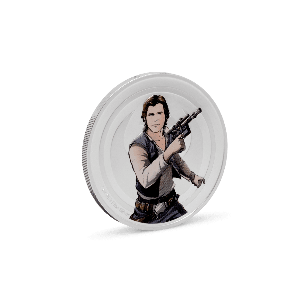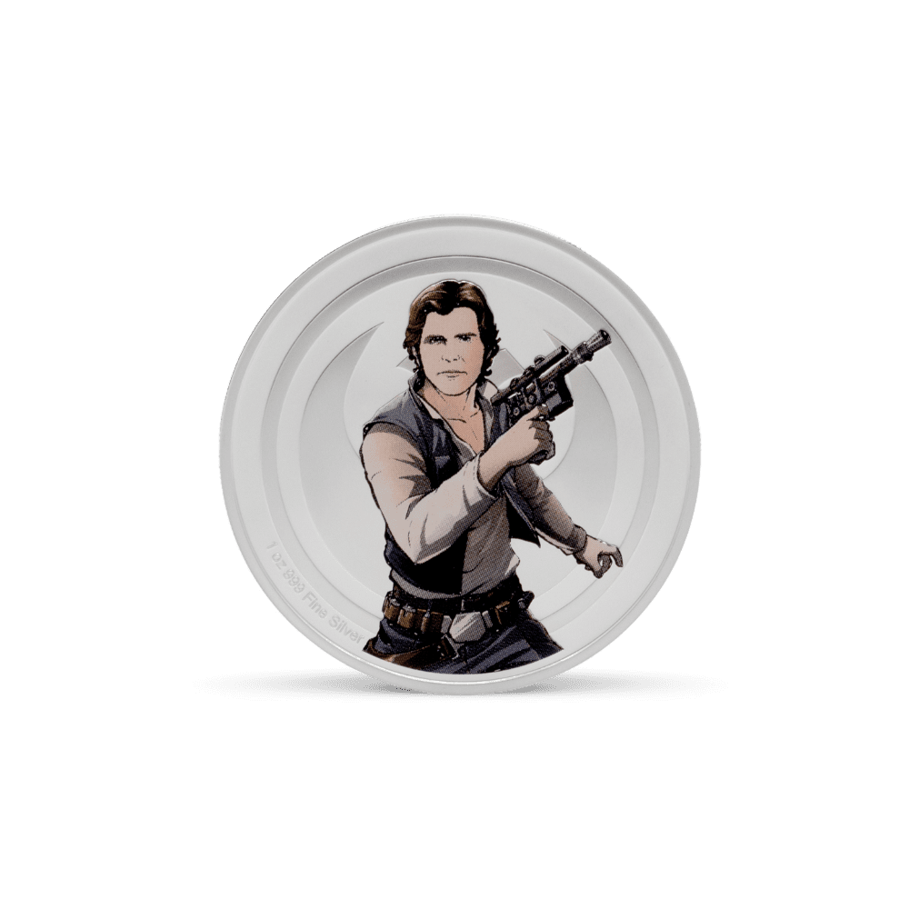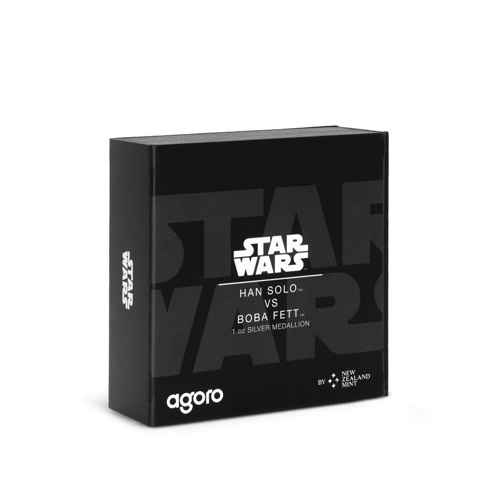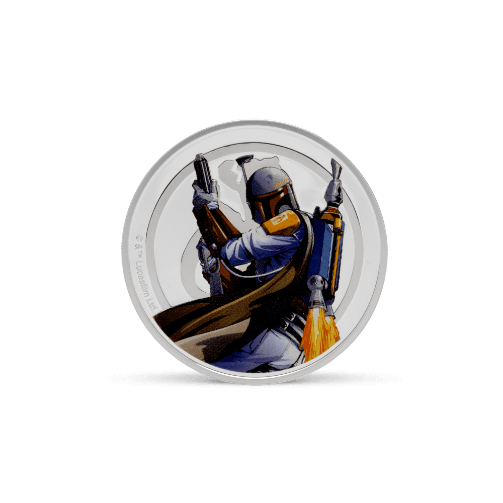 Bring the pulse of the Star Wars universe into your collection with this officially licensed 1oz medallion, crafted from 999 pure silver. The medallion captures a dramatic scene between Han Solo, blaster ready against the Rebel crest, and Boba Fett, poised with iconic Mandalorian symbolism. Each detail pops in vivid colour, elevated by deep engraved relief and expert sandblasting, making this silver collectible a showpiece for any Star Wars or coin enthusiast.
