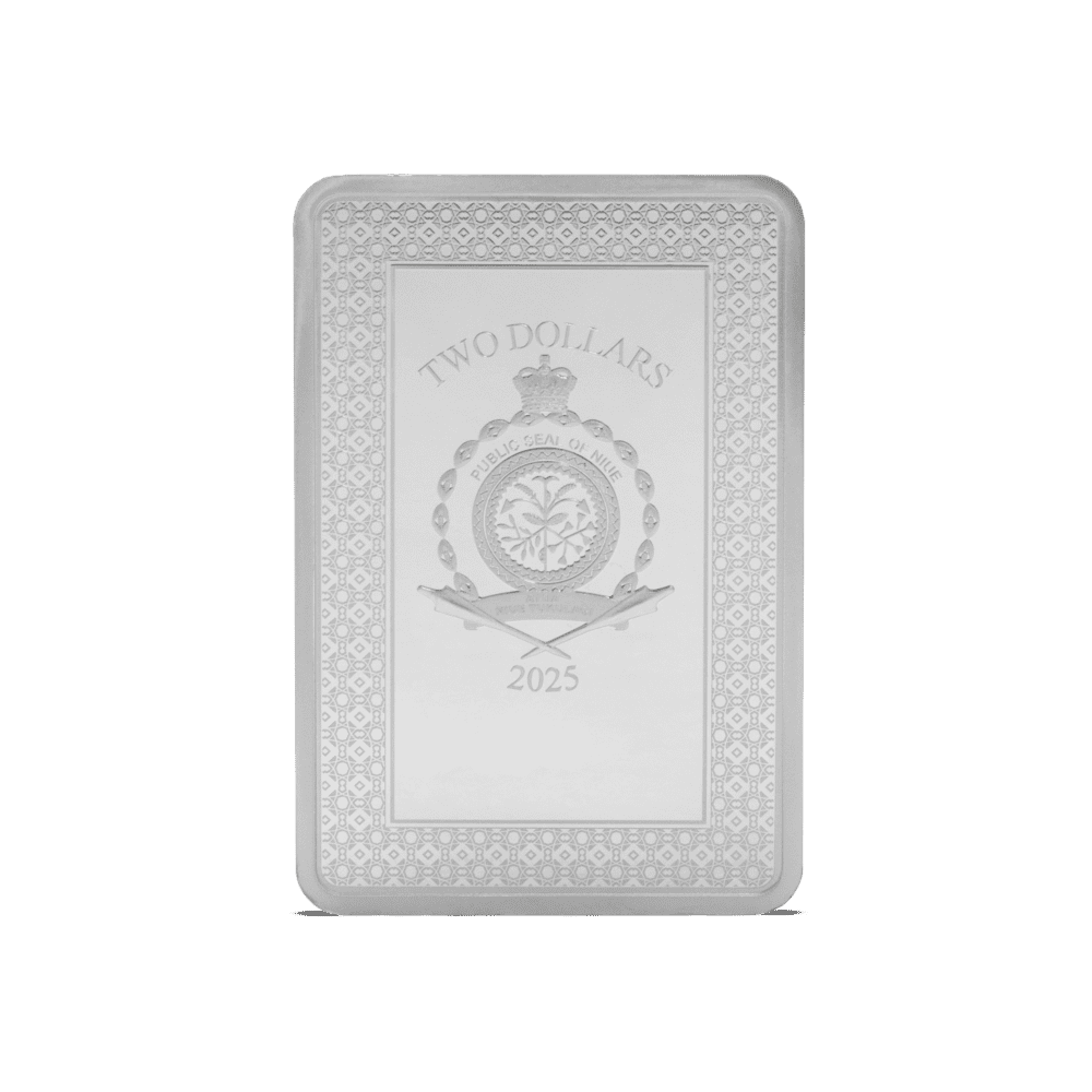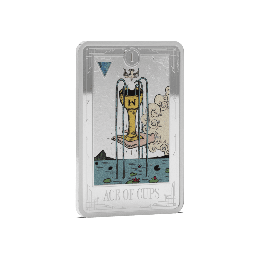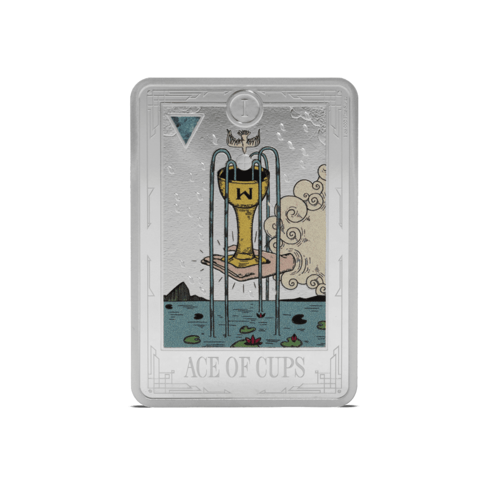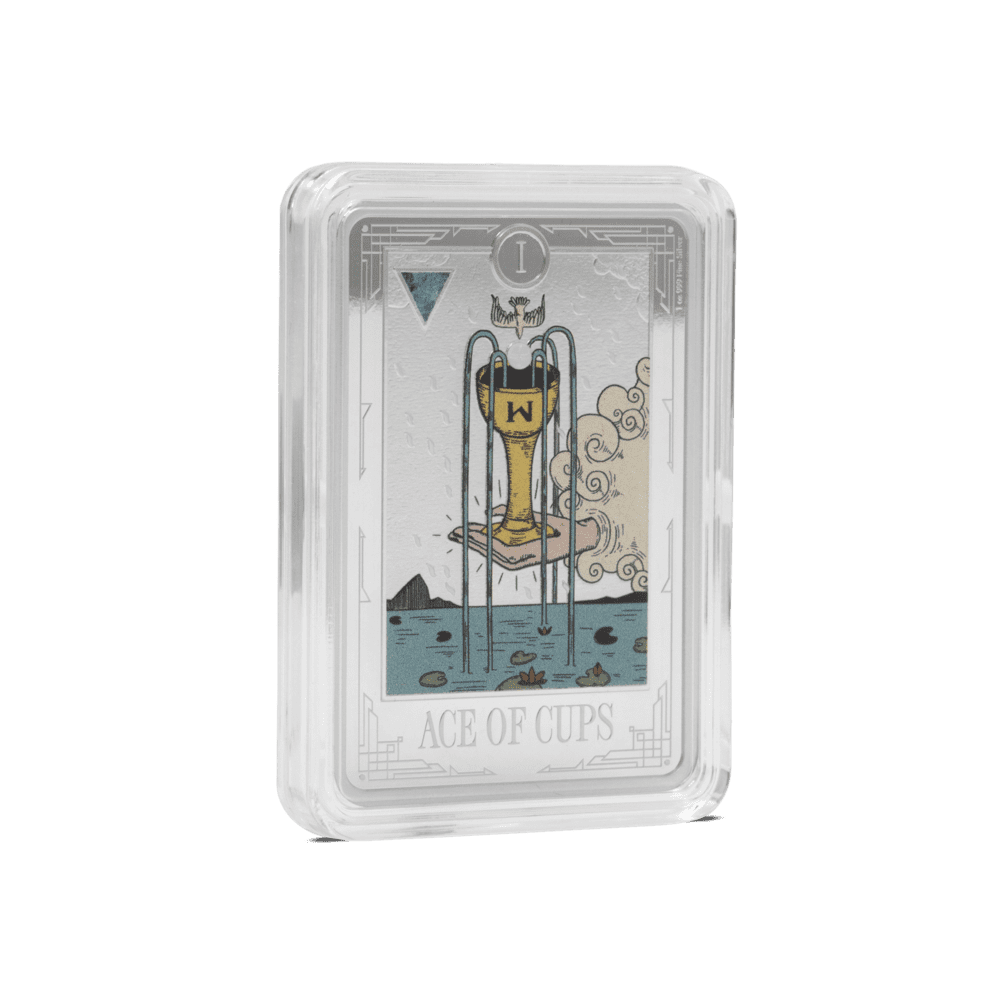 Step into the world of illustrated tarot with this $2 Ace of Cups 1oz silver proof coin, blending artistic detail and spiritual symbolism. Striking imagery features a golden chalice overflowing with five streams of water—set against frosted proof, colourful finish, and a mirror-like border. The unique light-blue triangle in the upper left highlights the alchemical symbol for water, immersing you in the Minor Arcana theme. Each 2025 silver coin is official legal tender from Niue, limited to a legendary mintage of just 1,000, and individually numbered for true collector appeal.