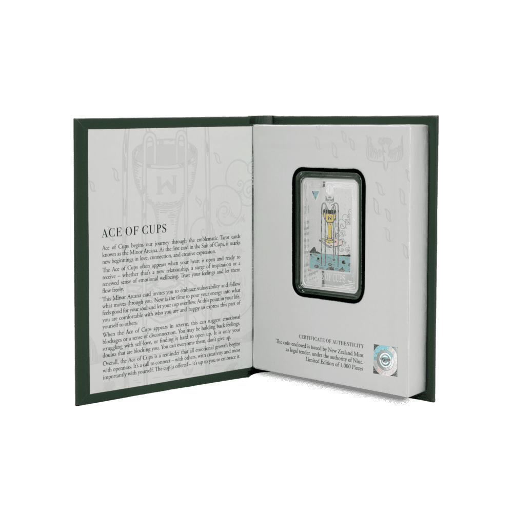 Produced in pure 999 silver with a proof finish, this 1oz collectible arrives in premium tarot-themed packaging, included with the Ace of Cups meaning inside. Ideal for tarot fans, silver coin collectors, or anyone wanting to add a limited-edition, numbered piece from the NZ Mint to their collection. Discover artistry, symbolism, and quality—The Coin Chest helps you embrace the next chapter of your numismatic journey.