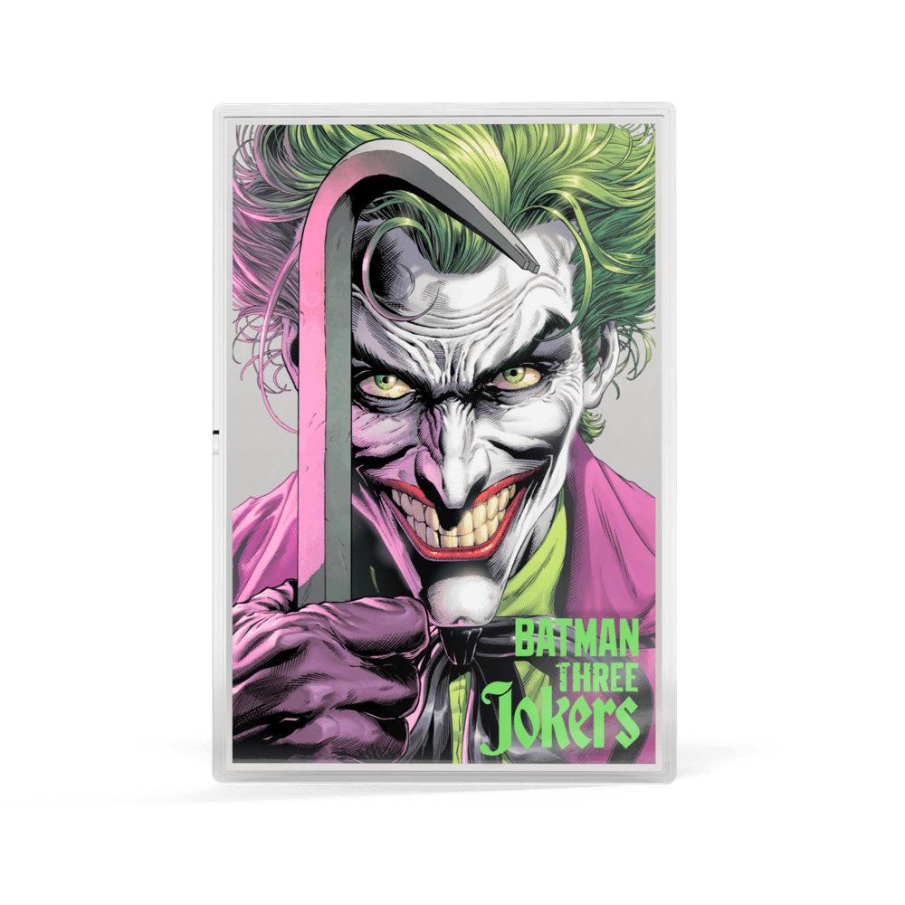 Enter the world of Batman collecting with this official $2 silver foil, inspired by the thrilling Batman Three Jokers storyline. Strikingly detailed, this pure 1oz 999 silver displays the menacing Clown Joker front and centre, complete with vibrant full-colour and the infamous crowbar. Flip to reveal a creative playing-card design—Joker faces Batman in a dramatic clash of chaos and justice. Only 1,000 individually numbered coins exist, and every legal tender issue from Niue is presented in themed DC Comics packaging. Plus, there’s a 10% chance of landing an ultra-collectable engraved chase variant with bold pink details for lucky buyers.