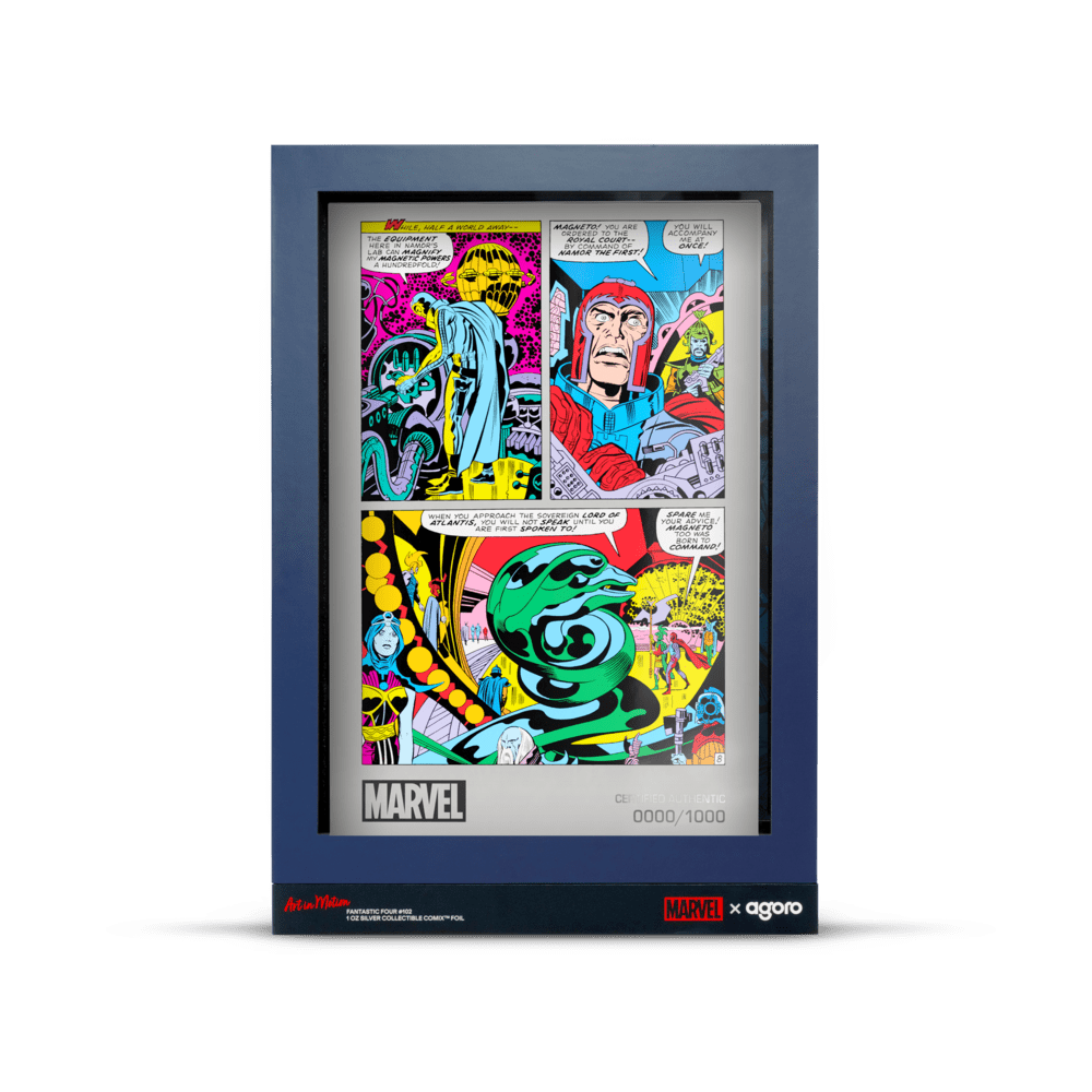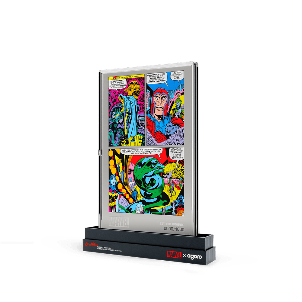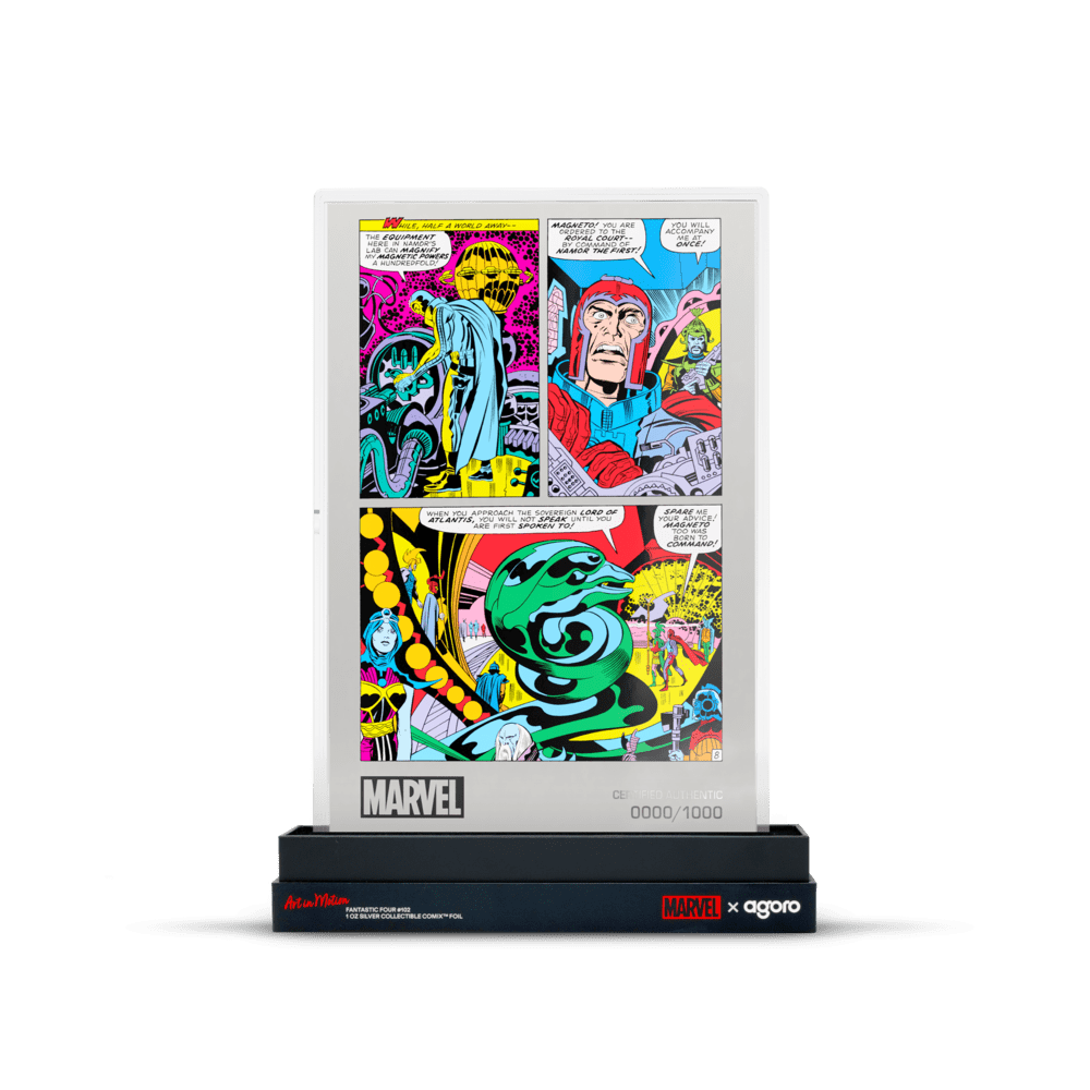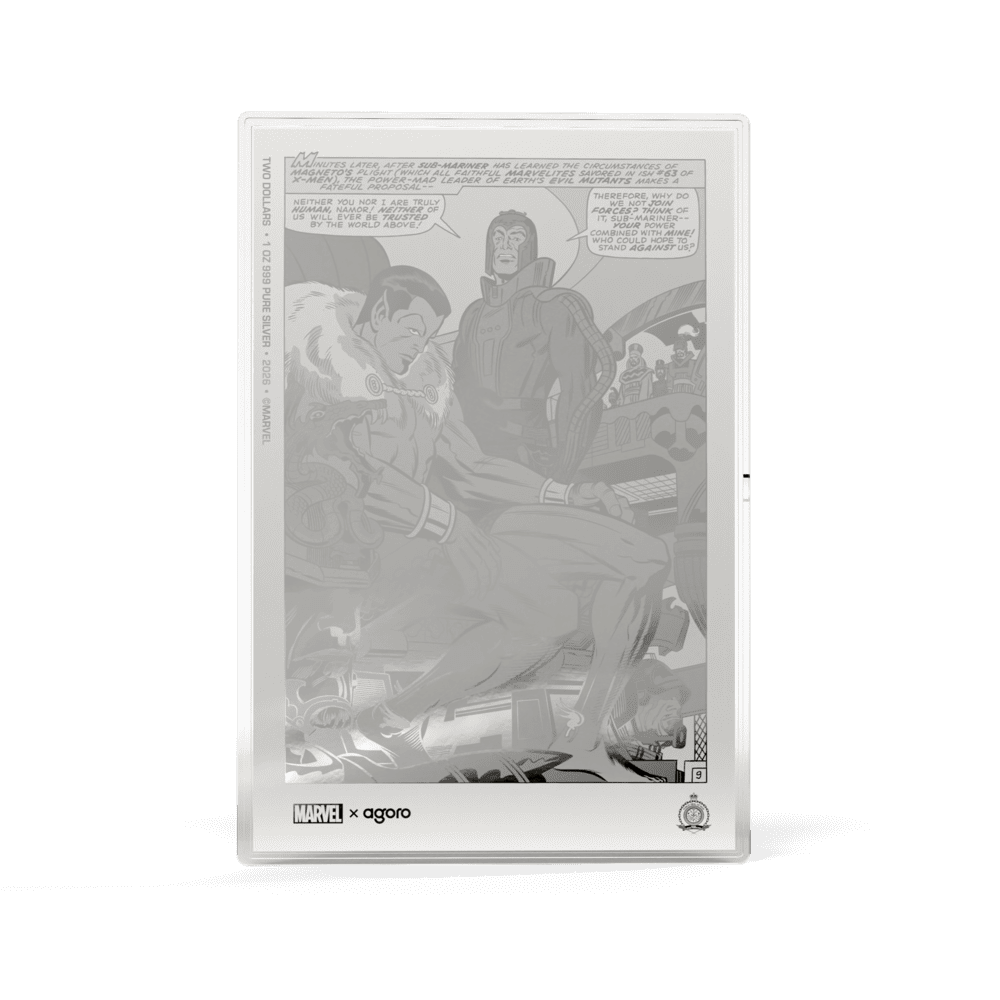Step into the pages of Marvel history with this officially licensed 2026 $2 COMIX™ Fantastic Four #102 1oz silver proof coin. Meticulously crafted from 1oz of 999 fine silver, this foil gives life to the clash between Magneto and Namor with dramatic comic artwork front and back — colour on one side and a striking black-and-white spread on the reverse. Measuring a generous 175mm by 262mm, each piece is individually numbered and presented in premium display packaging, making it the ideal centrepiece for fans of the Fantastic Four, Marvel, or collectors of limited silver coins.