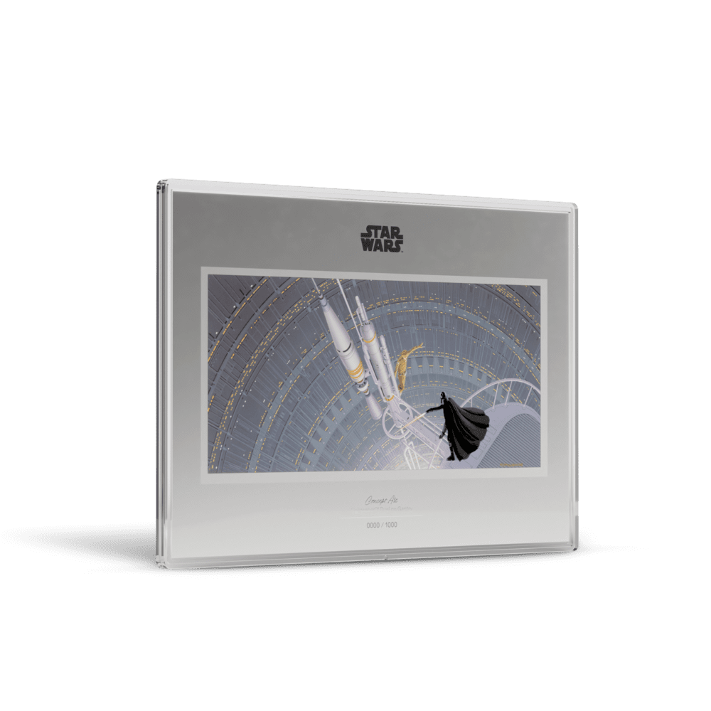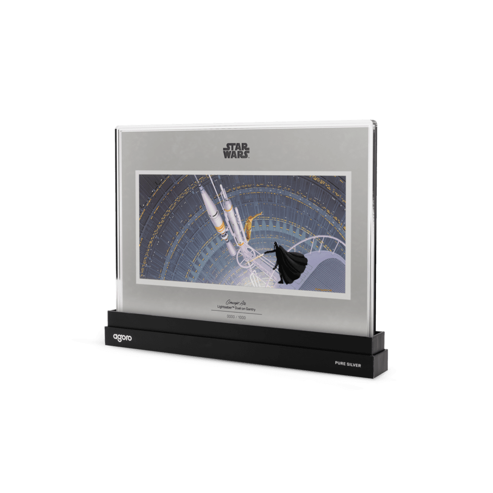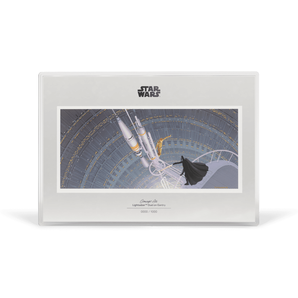 This officially licensed 1oz silver foil celebrates the iconic lightsaber duel between Darth Vader™ and Luke Skywalker™ on Cloud City™—a piece of concept art every Star Wars™ enthusiast will recognise. Crafted from 999 pure silver, it features a vivid full-colour scene bordered by a shimmering silver frame, with a frosted reverse and the Star Wars™ logo in mirror finish. Each collectible foil is uniquely numbered within its strict 1,000 mintage and arrives ready to display in its presentation packaging, complete with a Mark of Authenticity.