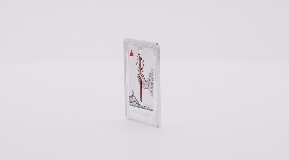 Step into possibility with this vibrantly coloured $2 Tarot Cards Ace of Wands 1oz silver proof coin. Crafted in 1oz of 999 pure silver, this coin captures the fiery creative spirit of the tarot’s Wands suit. It features a swirling hand clutching a wand, surrounded by dynamic smoke and crowned by a shimmering orange alchemical Fire symbol. With a mintage limited to only 1,000 coins, each piece is individually numbered and struck to proof quality, making it a cherished addition for both tarot enthusiasts and silver coin collectors.