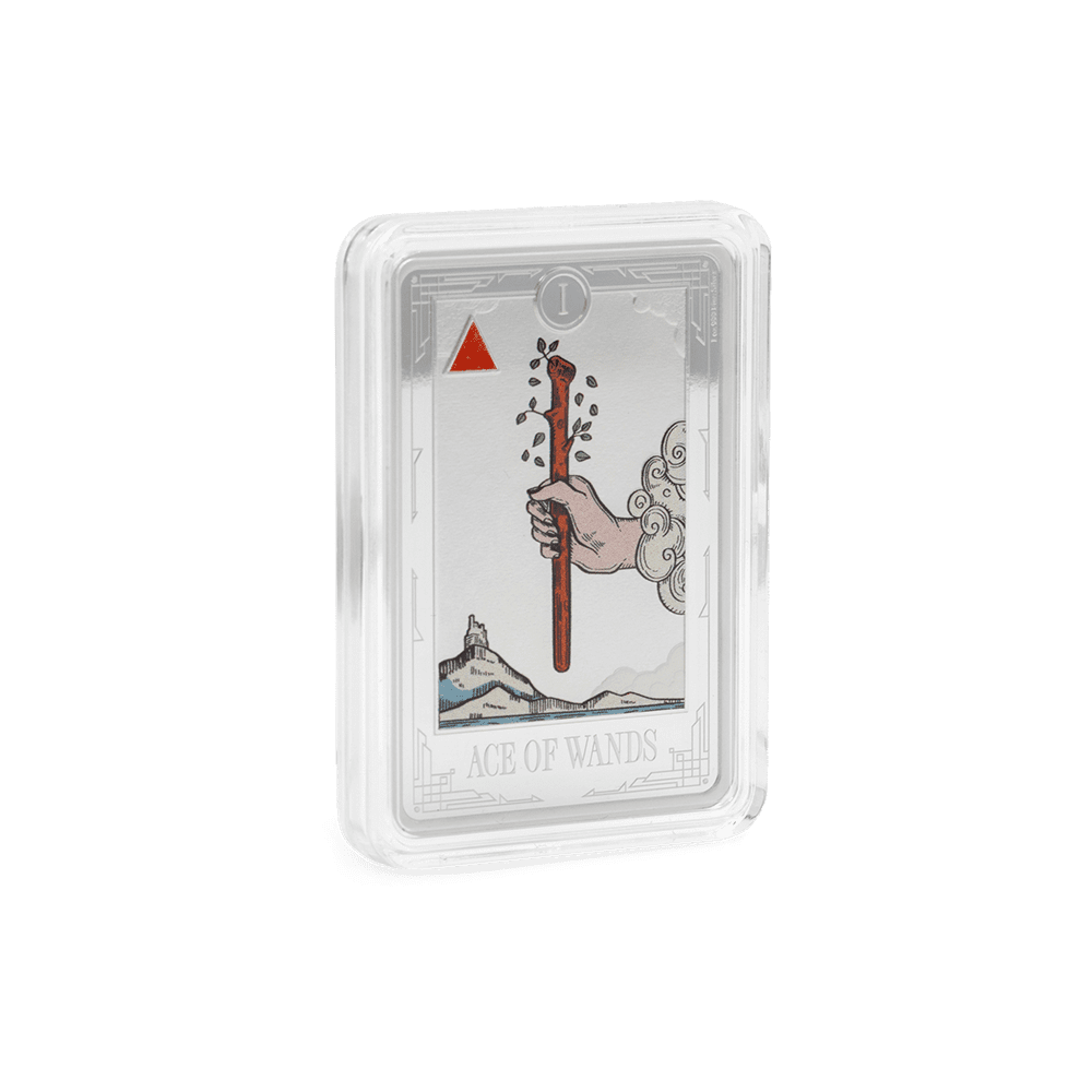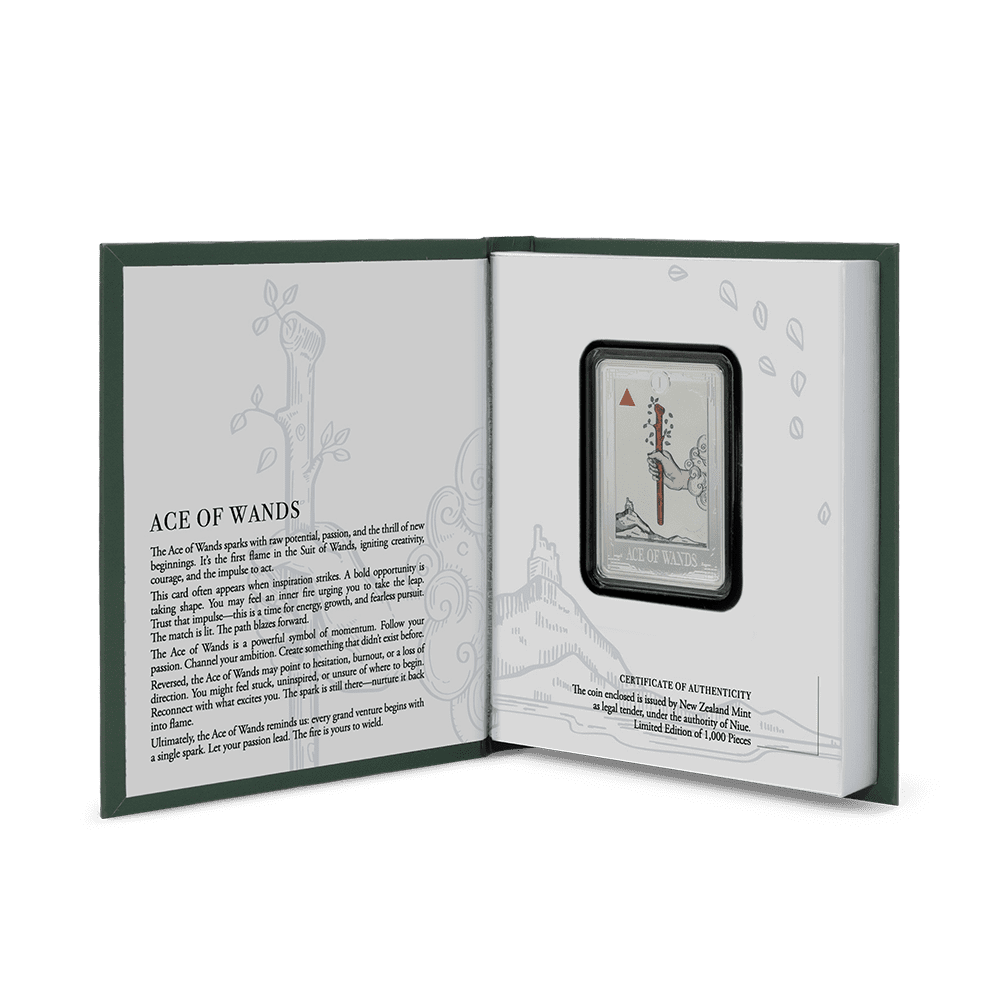 Iissued for Niue, this 2026 $2 silver coin is beautifully presented in tarot-themed packaging with a certificate of authenticity and the Public Seal of Niue on the obverse. Shaped and finished to highlight its vivid artistry, the Ace of Wands makes a powerful gift or centrepiece. Secure your inspiration with this uniquely crafted, limited mintage silver collectable from The Coin Chest today.