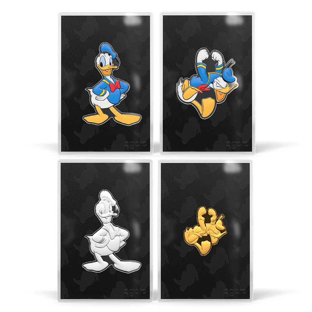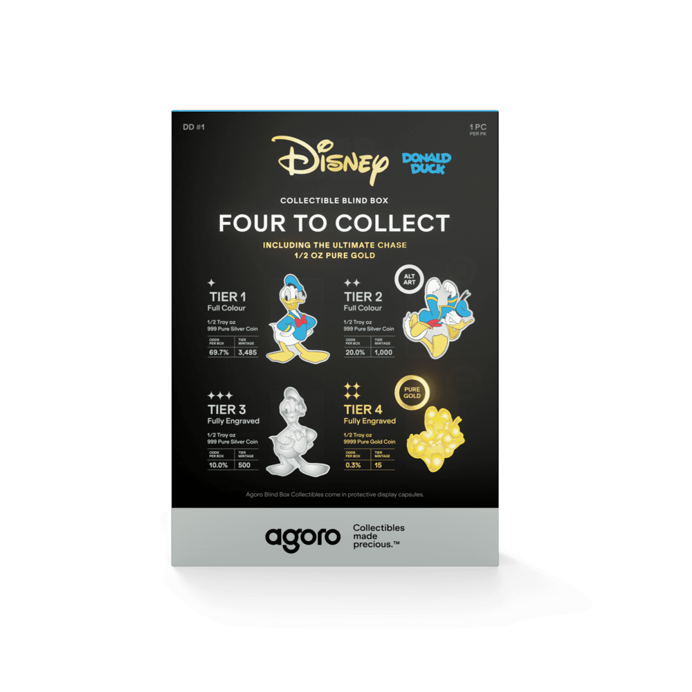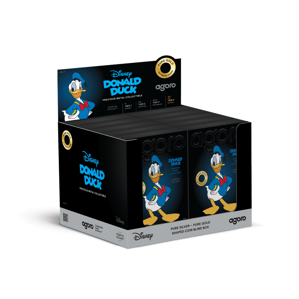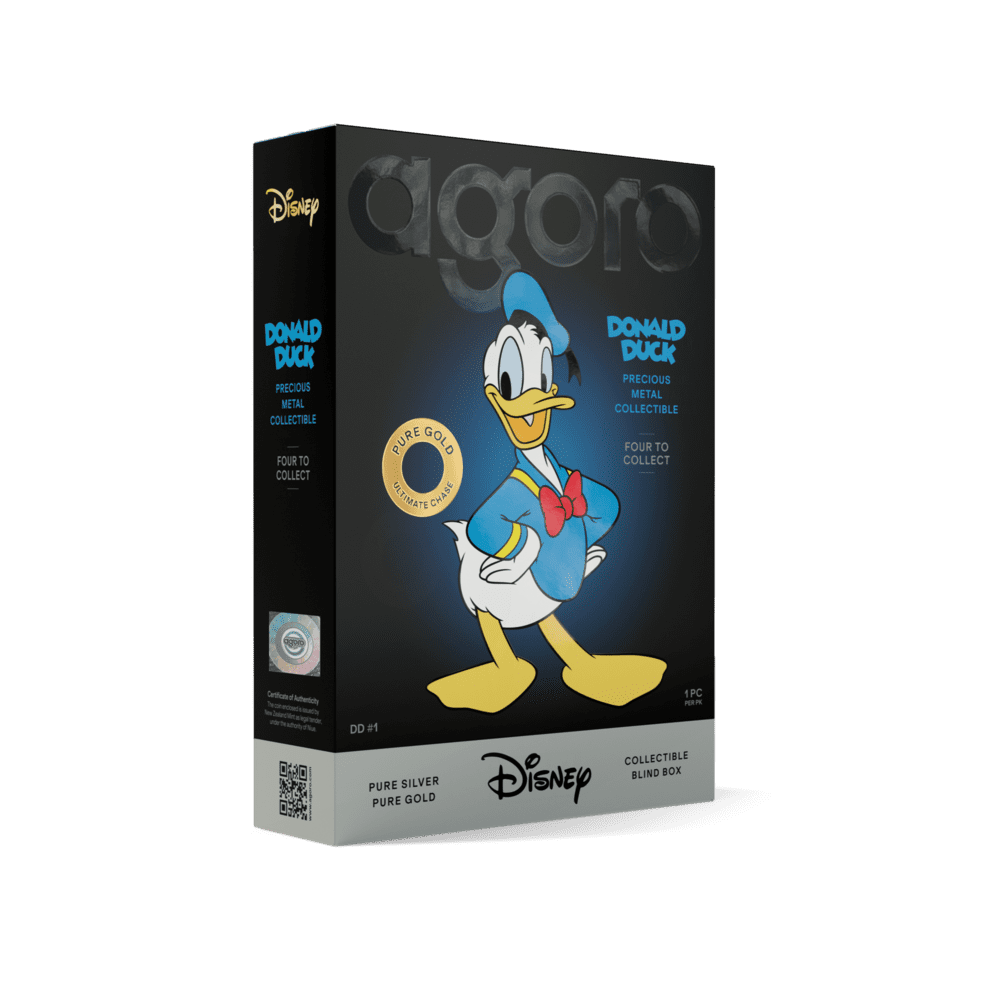 Jump into Disney magic with this sealed blind box, each holding a special Donald Duck surprise! Struck in either fine 999 silver or rare 9999 gold, every limited-edition blind box features one of four vivid designs capturing Donald Duck’s classic personality—from cheerful sailor-suit charm to a mirror-finish outburst. Every coin is officially issued for Niue, with a super limited mintage of just 5,000, making this an essential for fans of Disney, collectors of blind boxes, or anyone after a unique Donald Duck collectable.