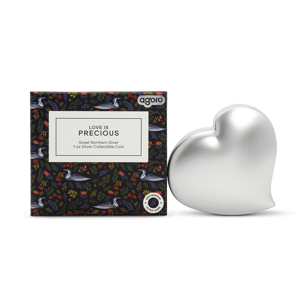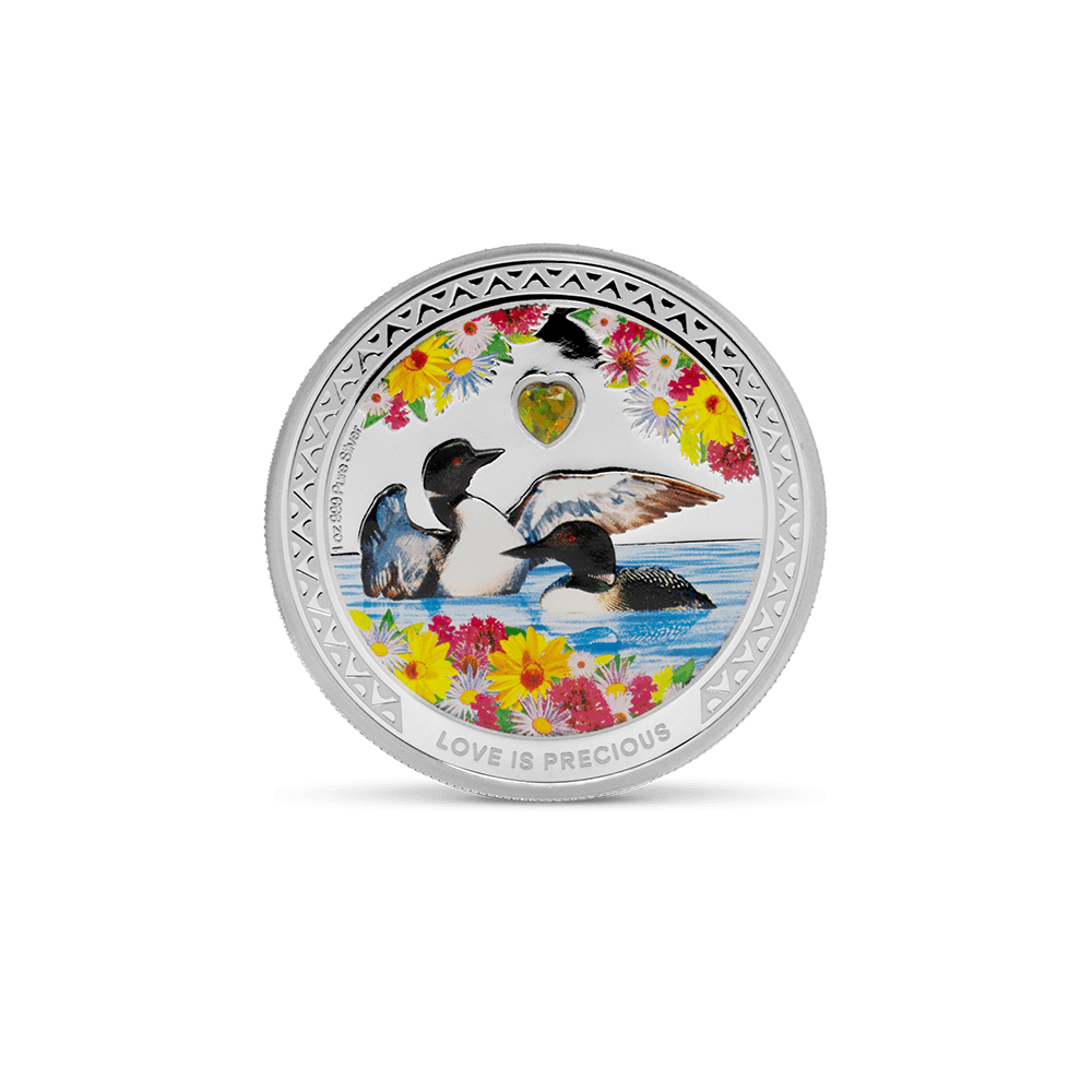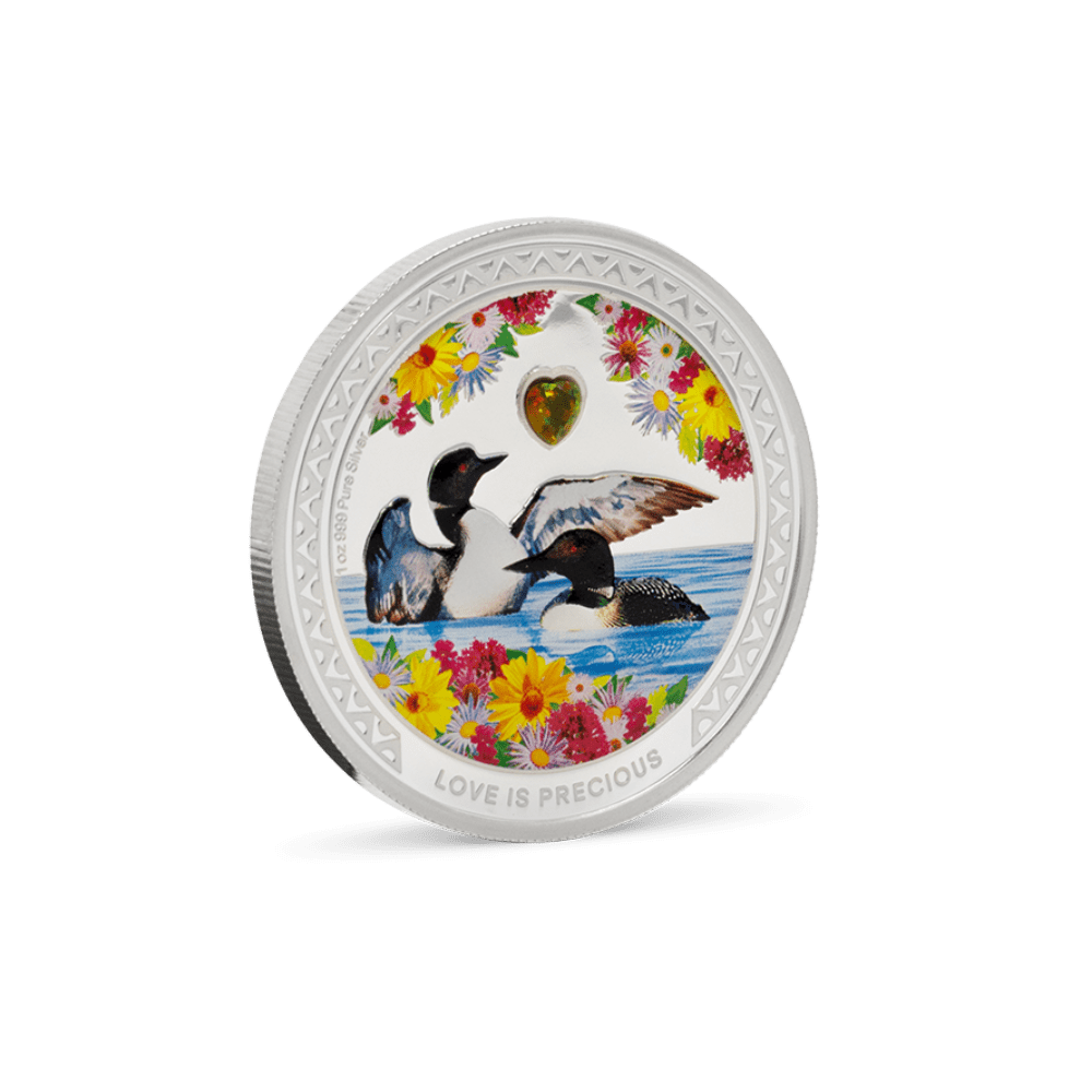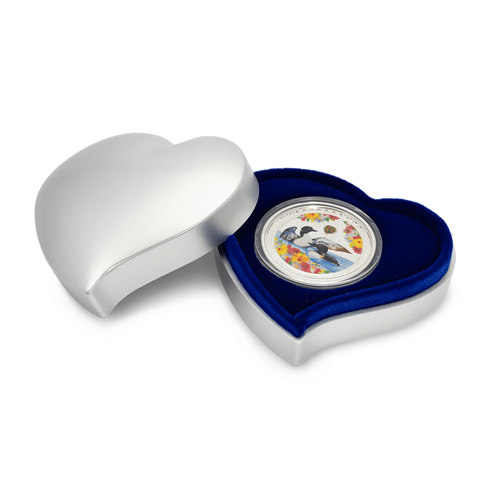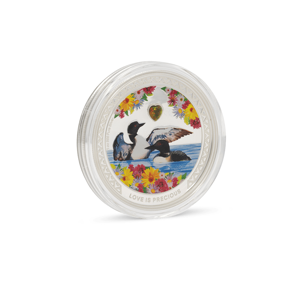 This elegant $2 Great Northern Diver coin, crafted from 1oz .999 fine silver and struck to proof standard, makes a heartfelt collectible or gift. Showcasing two vividly coloured Great Northern Divers nestled amongst blossoms, it symbolises devotion and the natural beauty of life mates. The “Love is Precious” engraving, exclusive heart-shaped presentation box, and certificate of authenticity all add to its appeal, while the limited mintage of just 2,000 pieces ensures collectability.