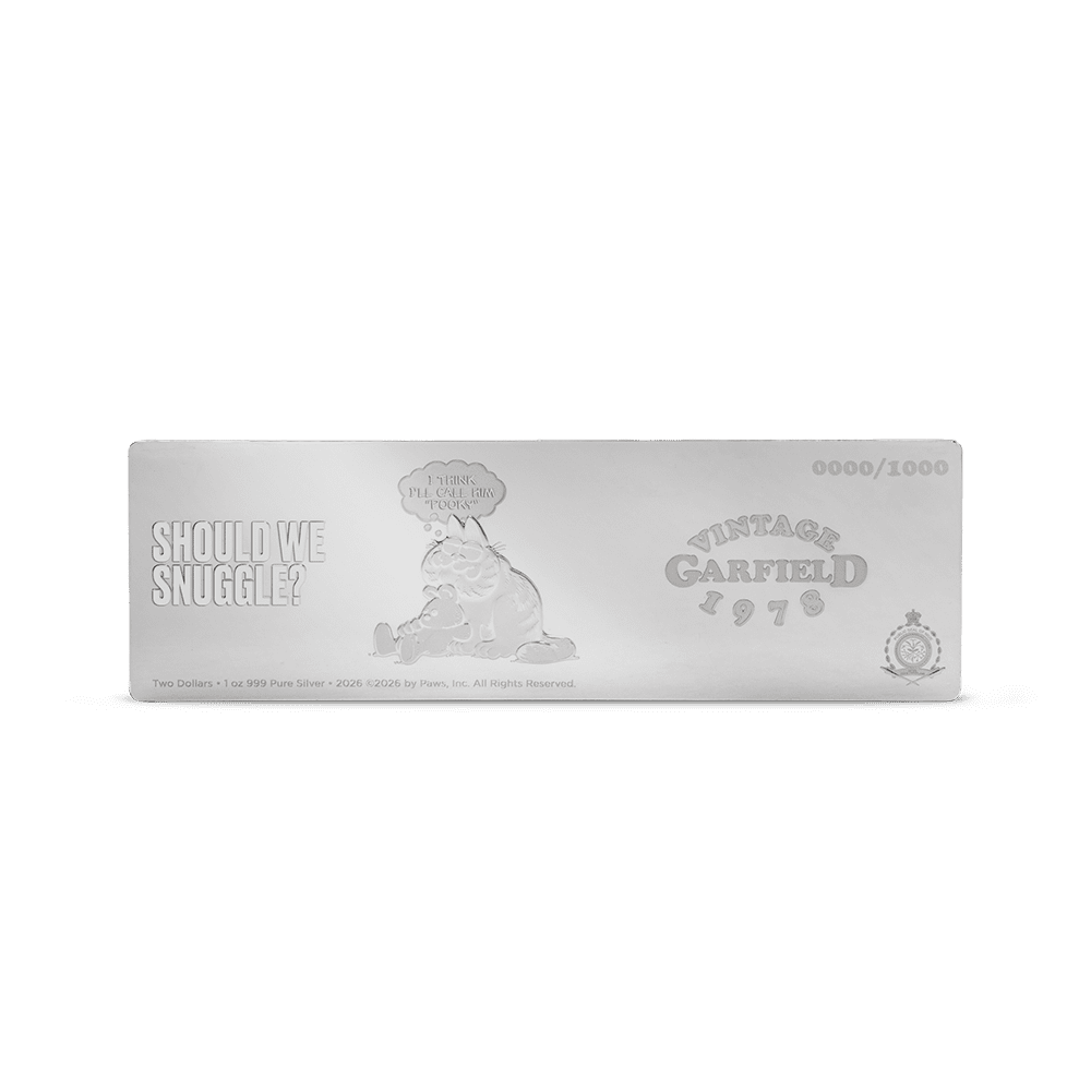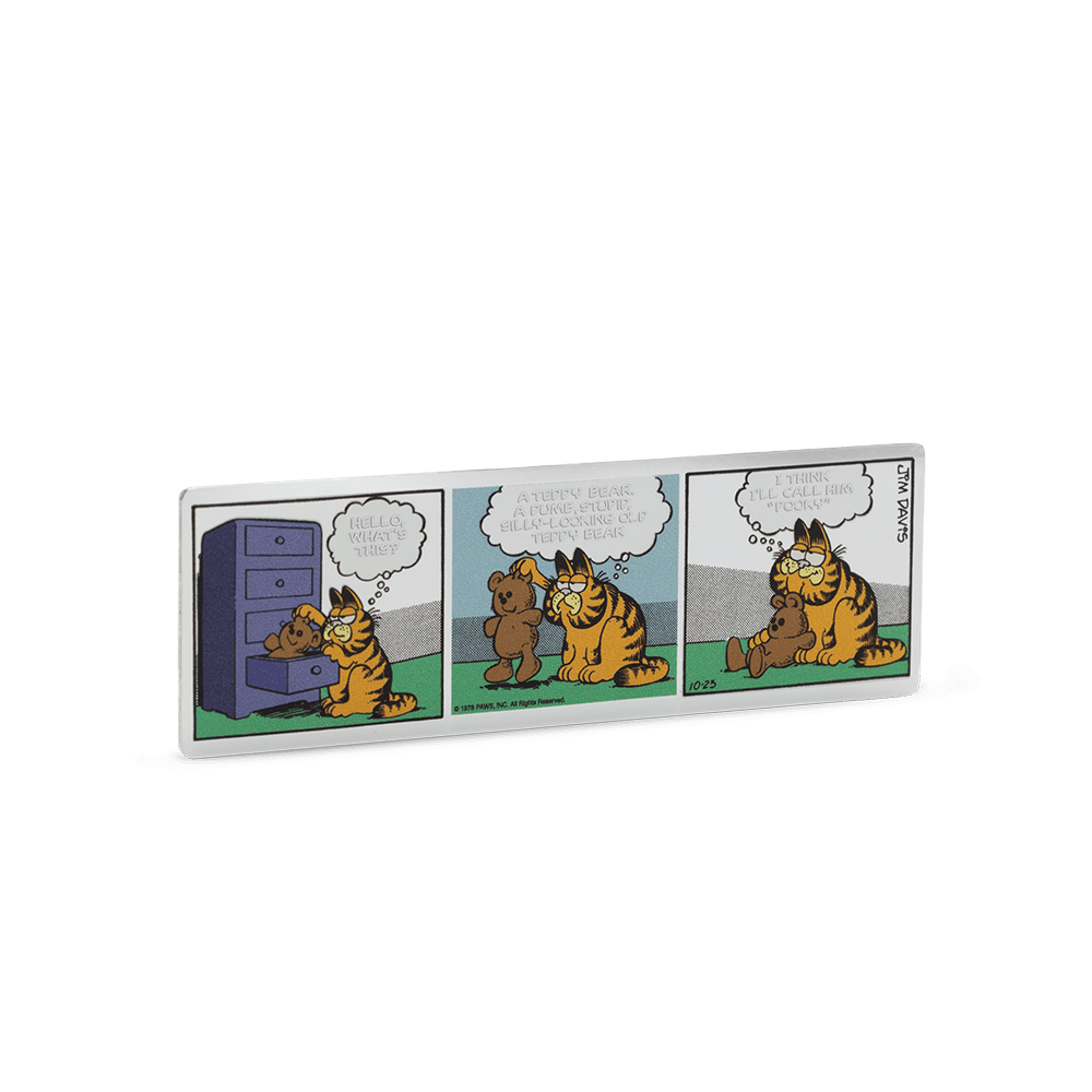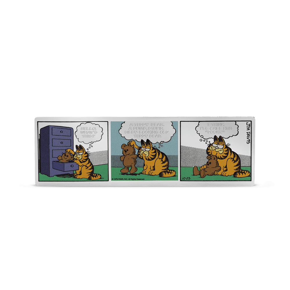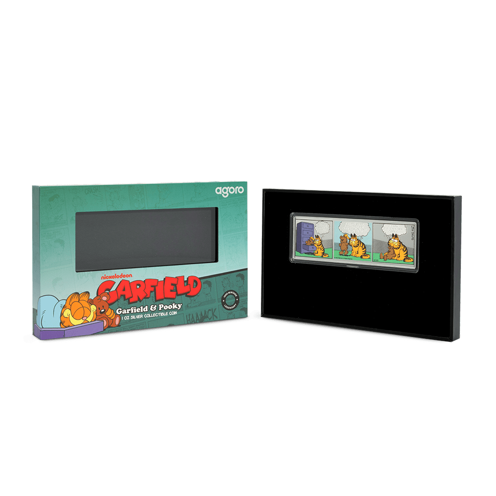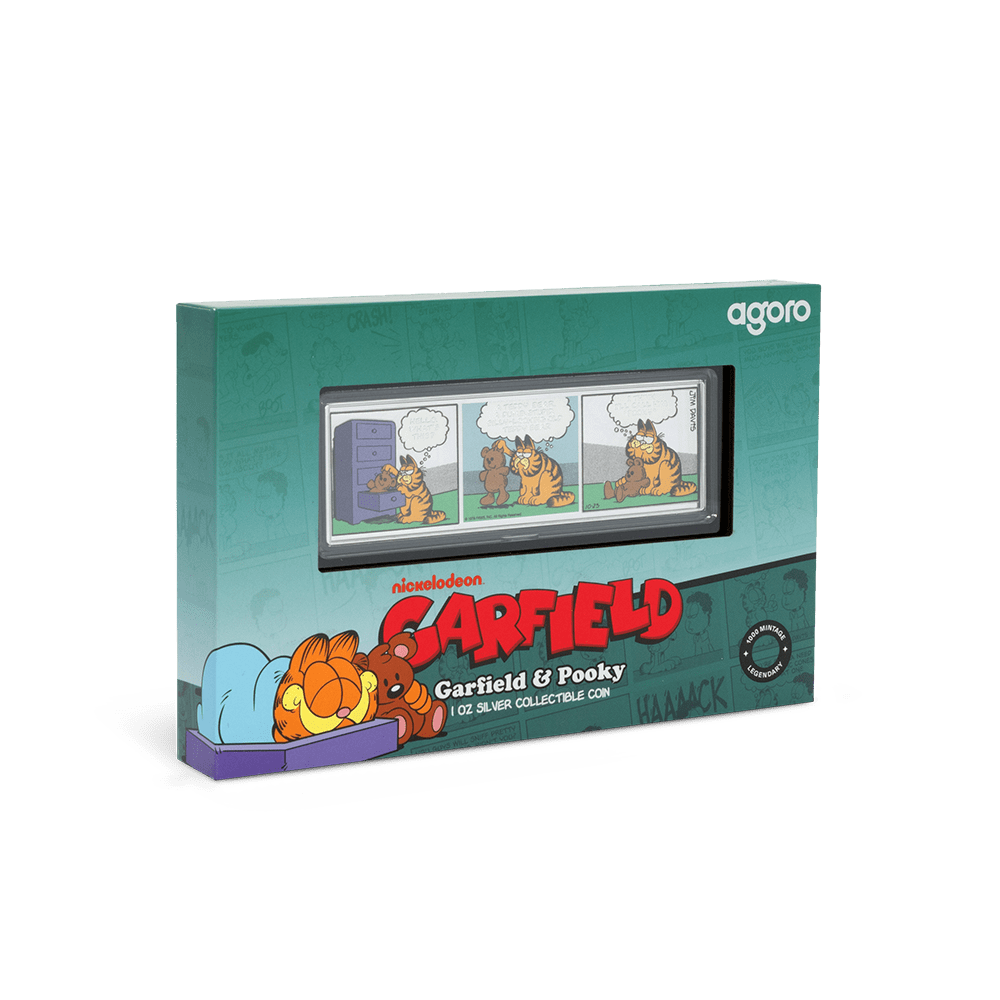This dazzling 1oz silver coin brings to life the iconic 1978 three-panel comic strip—Garfield discovering his loyal teddy, Pooky—in vibrant, full-colour detail. Struck in .999 pure silver with a mirror-proof finish, each piece pairs a frosted Garfield portrait and engraved quotes on the reverse, uniquely numbered for collectors. Endorsed by the Public Seal of Niue, it’s legal tender with a limited mintage of only 1,000 worldwide. Every coin arrives in themed, windowed Garfield packaging, complete with the Mark of Authenticity—ideal for fans of Nickelodeon, Garfield and precious metal collectables alike.