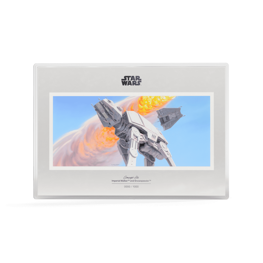 Bring home an iconic Star Wars™ moment in pure 1oz silver with striking concept art of the Imperial Walker™ and Snowspeeder™ as seen on the icy fields of Hoth. This collectable format captures every detail – from the looming AT-AT™ advancing across a vibrant, full-colour battlefield to the Snowspeeder™ darting past a fiery explosion – all within a frosted and mirror-finish silver border. Officially licensed by Lucasfilm and issued as $2 legal tender for Niue, this release is strictly limited to just 1000 coins, making it a rare centrepiece for any Star Wars or silver coin collection.