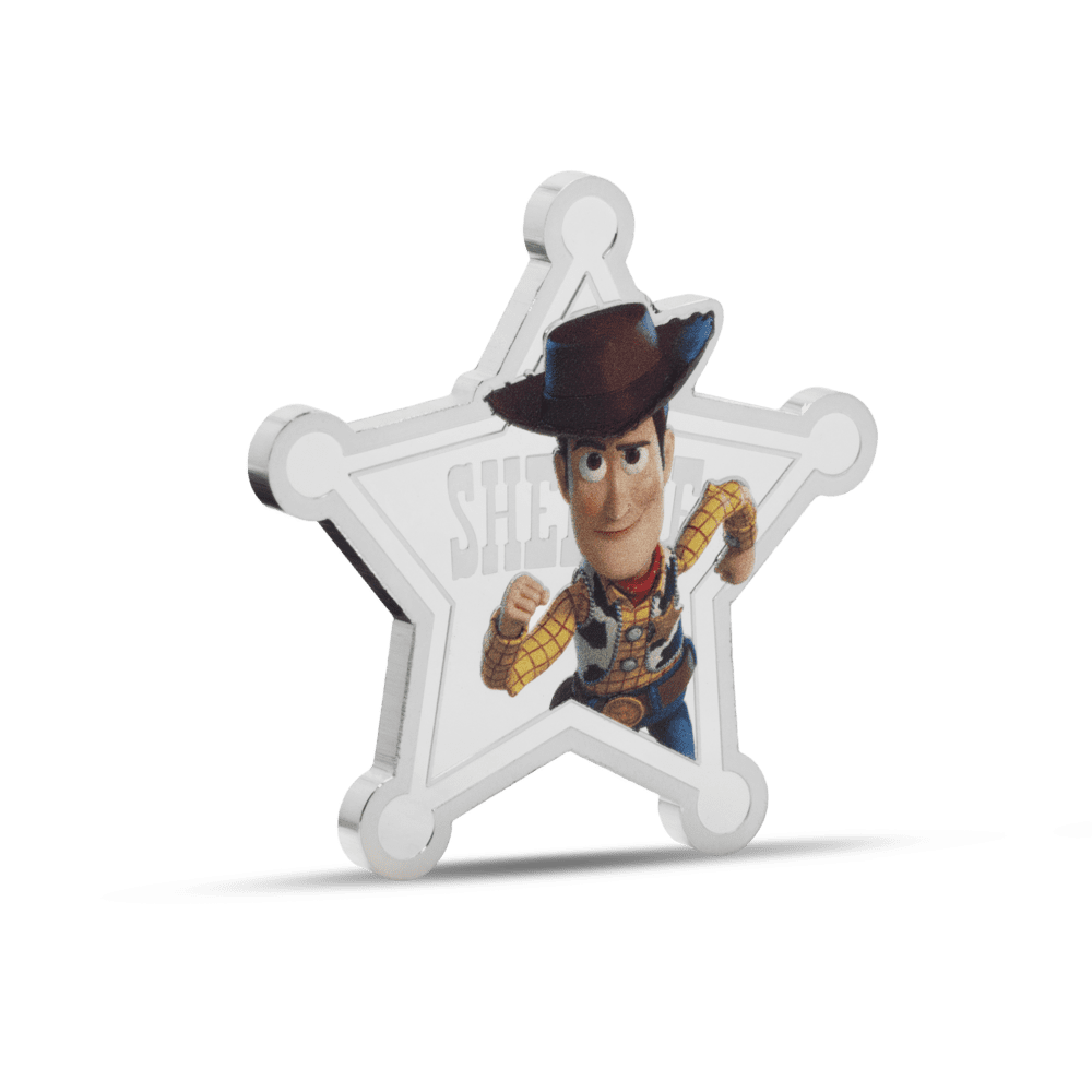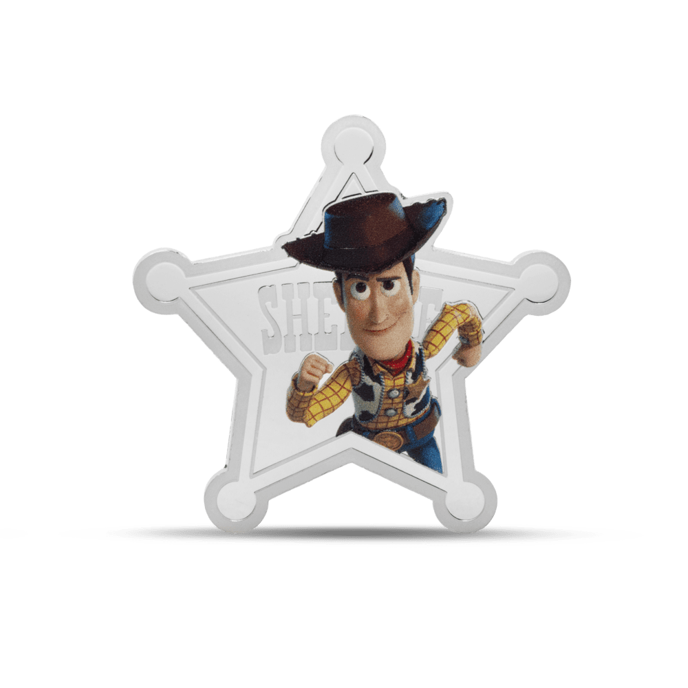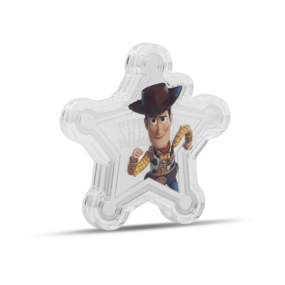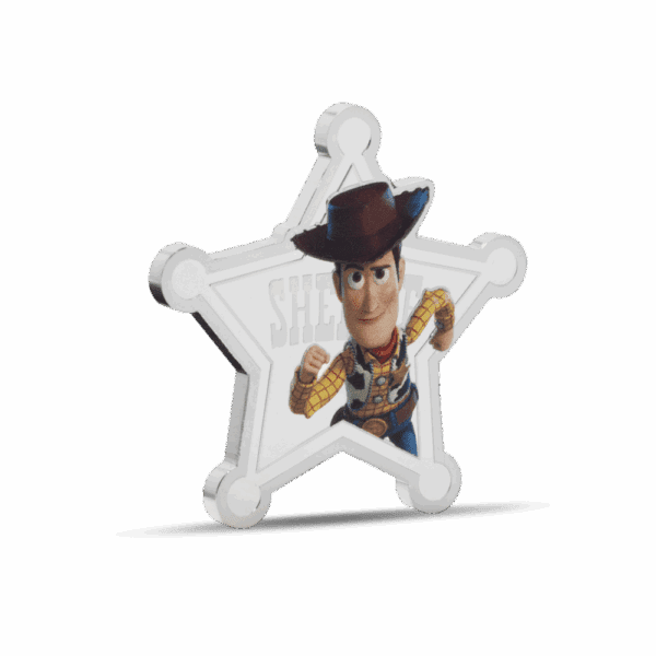Add a piece of movie history to your display with this officially licensed Disney Pixar Toy Story 30th anniversary Woody 1oz silver proof coin. Designed in the exact shape of Woody’s iconic sheriff star, this 999 pure silver collectible dazzles with a coloured image of Woody as fans first saw him in 1995. The proof finish and frosted silver details make this unique memento a standout tribute to Toy Story, blending beloved Disney characters with the enduring value of a precious metal coin.