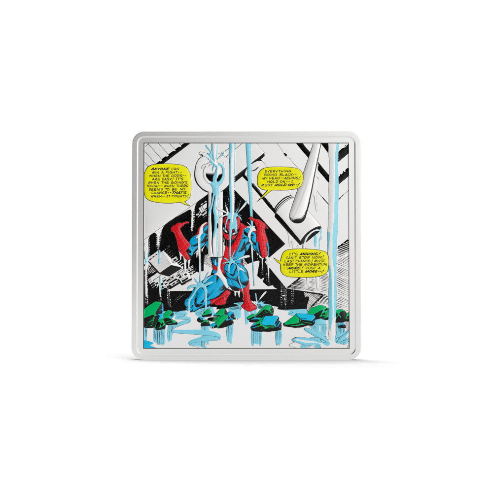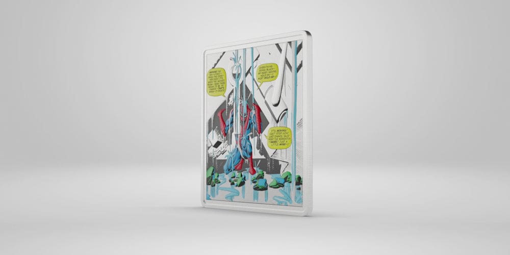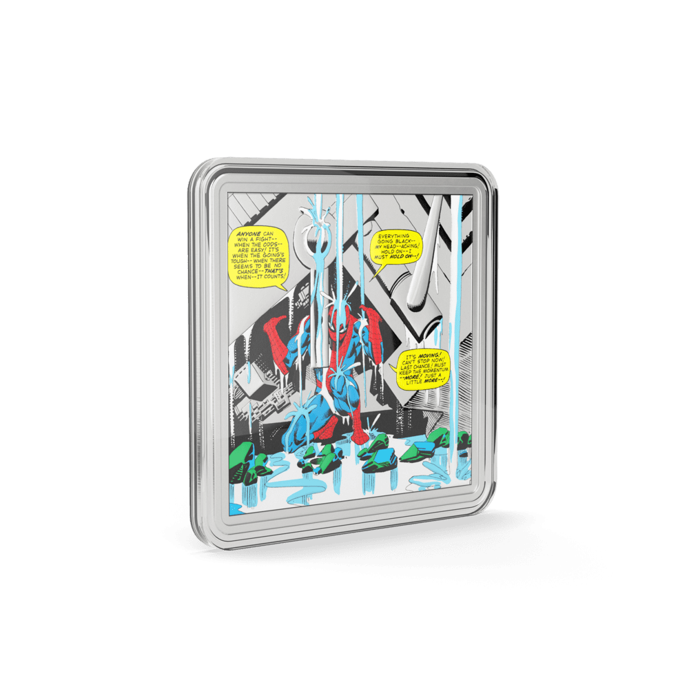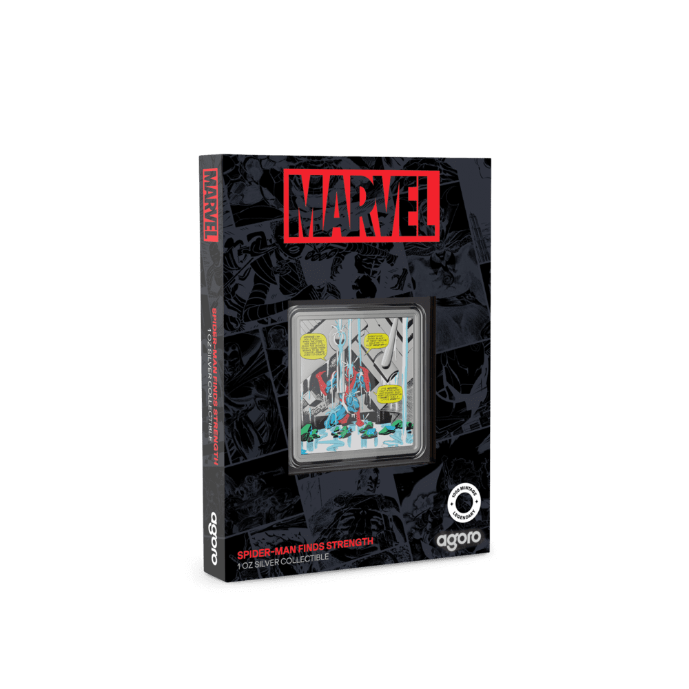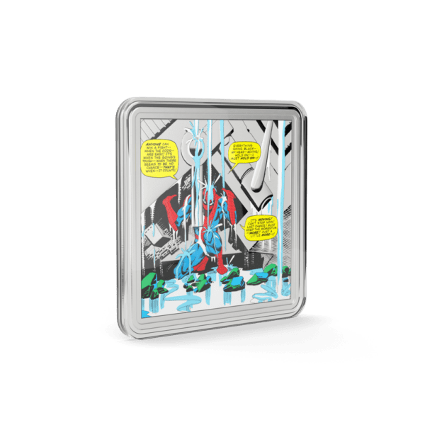 Celebrate the unforgettable Amazing Spider-Man #33 scene with this officially licensed 1oz silver coin, where Peter Parker’s iconic moment of finding strength is brought to life in vivid full-colour. Meticulously struck from 999 pure silver, this Marvel collectible features raised and coloured water effects over a matte silver background, adding real movement and drama. Marvel fans will appreciate original comic panel details and Spider-Man’s powerful dialogue, all presented in Marvel-themed packaging and individually numbered for authenticity.