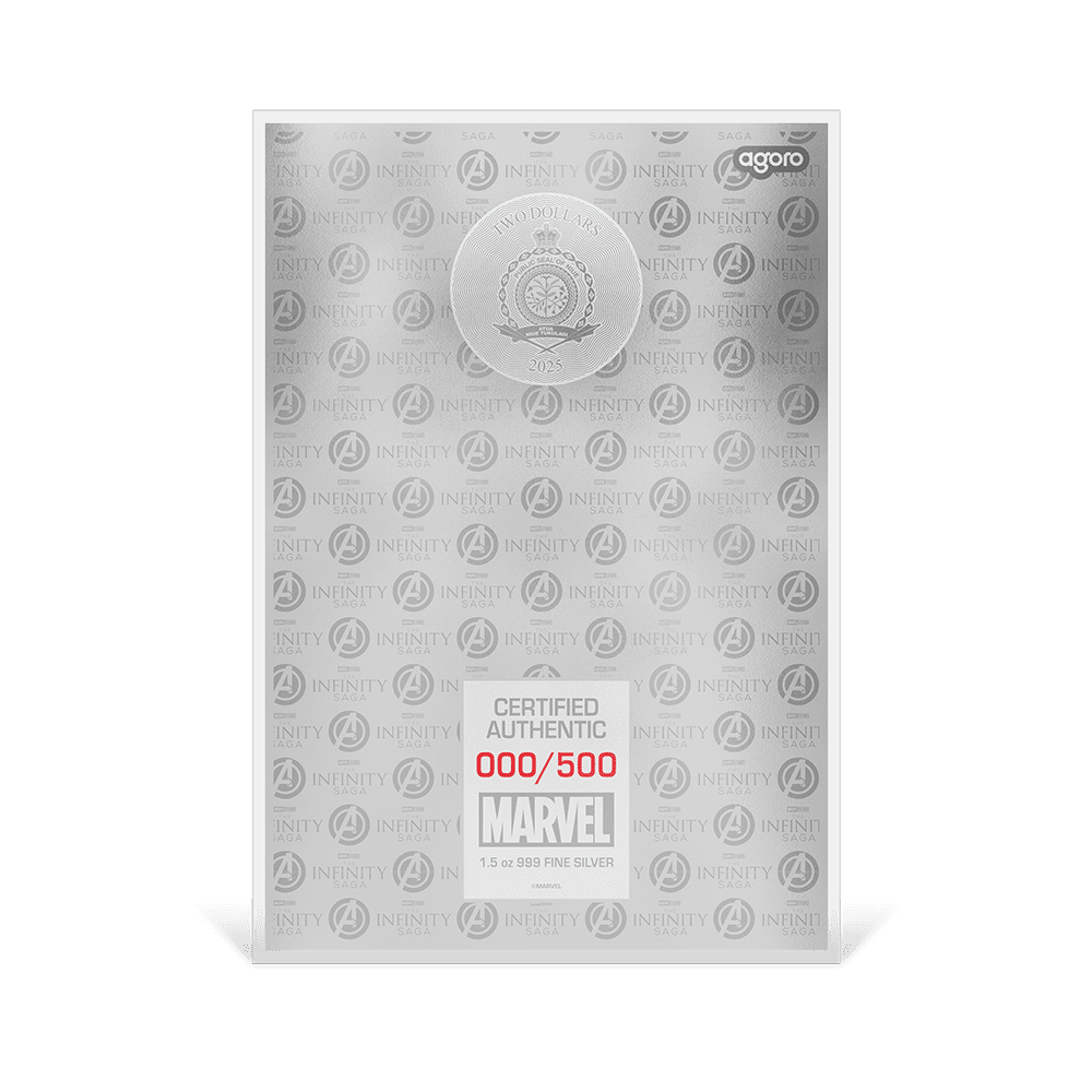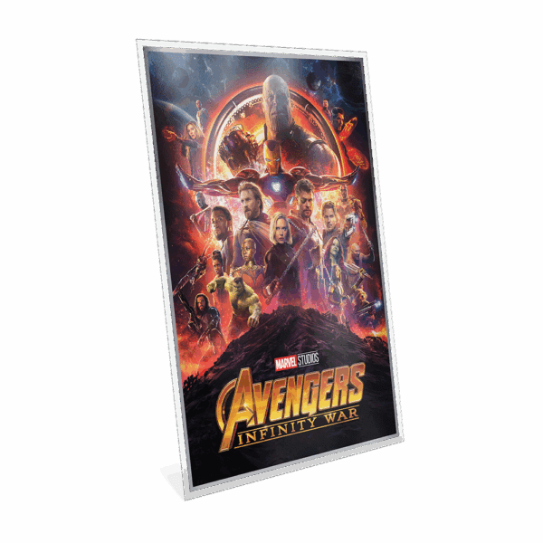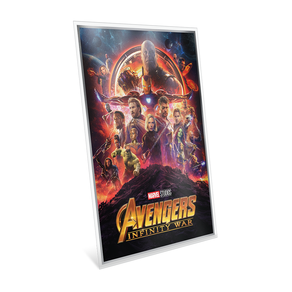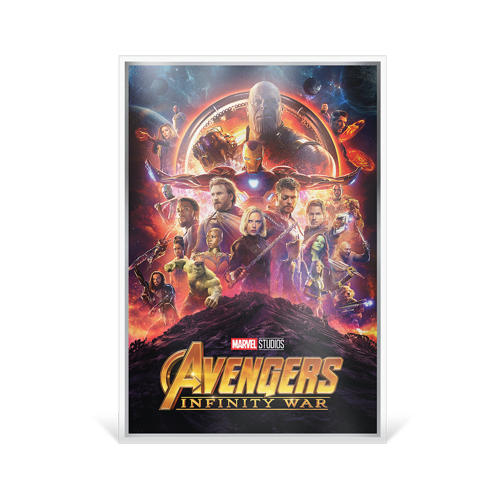 This officially licensed silver foil features the dramatic full-colour Avengers: Infinity War poster, faithfully recreated with vivid imagery, iconic characters, and the looming threat of Thanos. Struck in 1.5oz of 999 pure silver and measuring an impressive 216mm x 320mm, the design includes a metallic finish with a frosted frame for standout detail and depth. Only 500 foils exist worldwide, each uniquely numbered and presented in secure Marvel-branded packaging with a mark of authenticity.