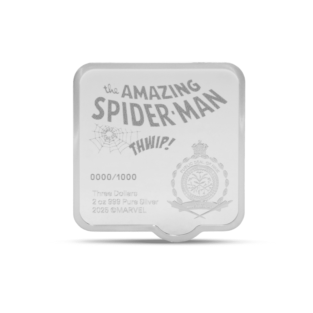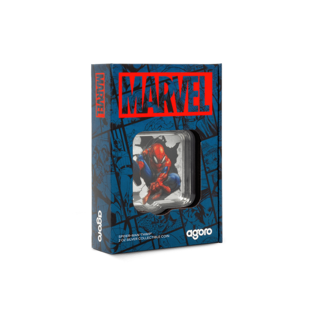 Celebrate your love for Spider-Man and Marvel with this officially licensed $2 silver proof coin, crafted from 2oz of 999 pure silver and finished in meticulous proof quality with vivid colour. Marvel fans and collectors alike will be drawn to the eye-catching ultra-high relief design showing Spider-Man swinging energetically through city rubble. The dramatic “THWIP!” is a striking tribute to Spidey’s heroic theme, complemented by frosted details and the legal tender Public Seal of Niue on the reverse. Only 1,000 coins worldwide makes this a truly limited collectible, each presented in premium Marvel packaging with its unique serial number.