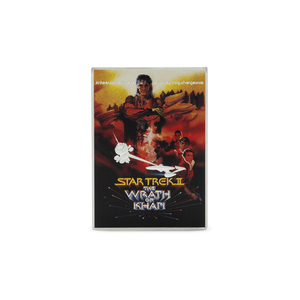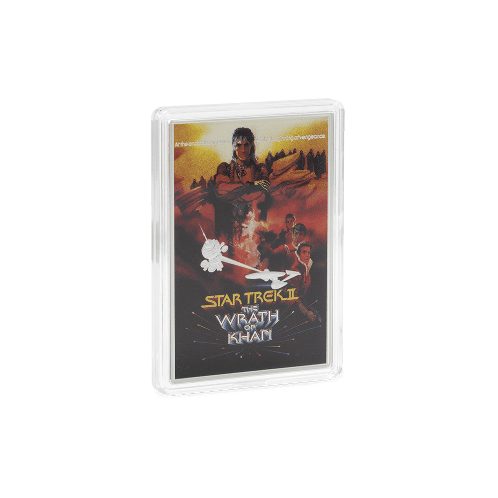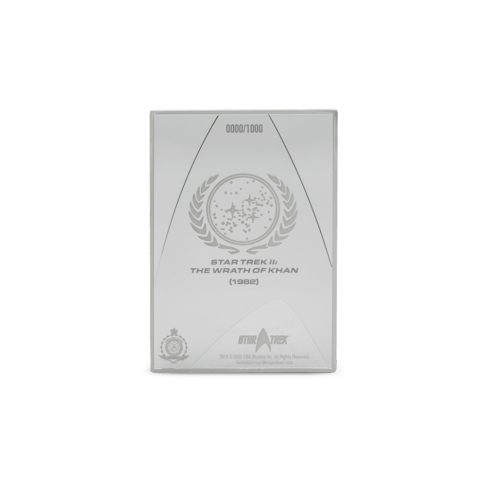 Mark a cinematic milestone with this officially licensed $2 silver proof coin, stunningly capturing the epic Star Trek II: The Wrath of Khan movie poster. Struck in 1oz of 999 pure silver, the design features vivid colour and frosted detailing, perfectly showcasing the drama and style of the original 1981 artwork. The coin’s rectangular format makes it an eye-catching centrepiece, while the individually numbered reverse and the Public Seal of Niue confirm its authenticity and legal tender status.