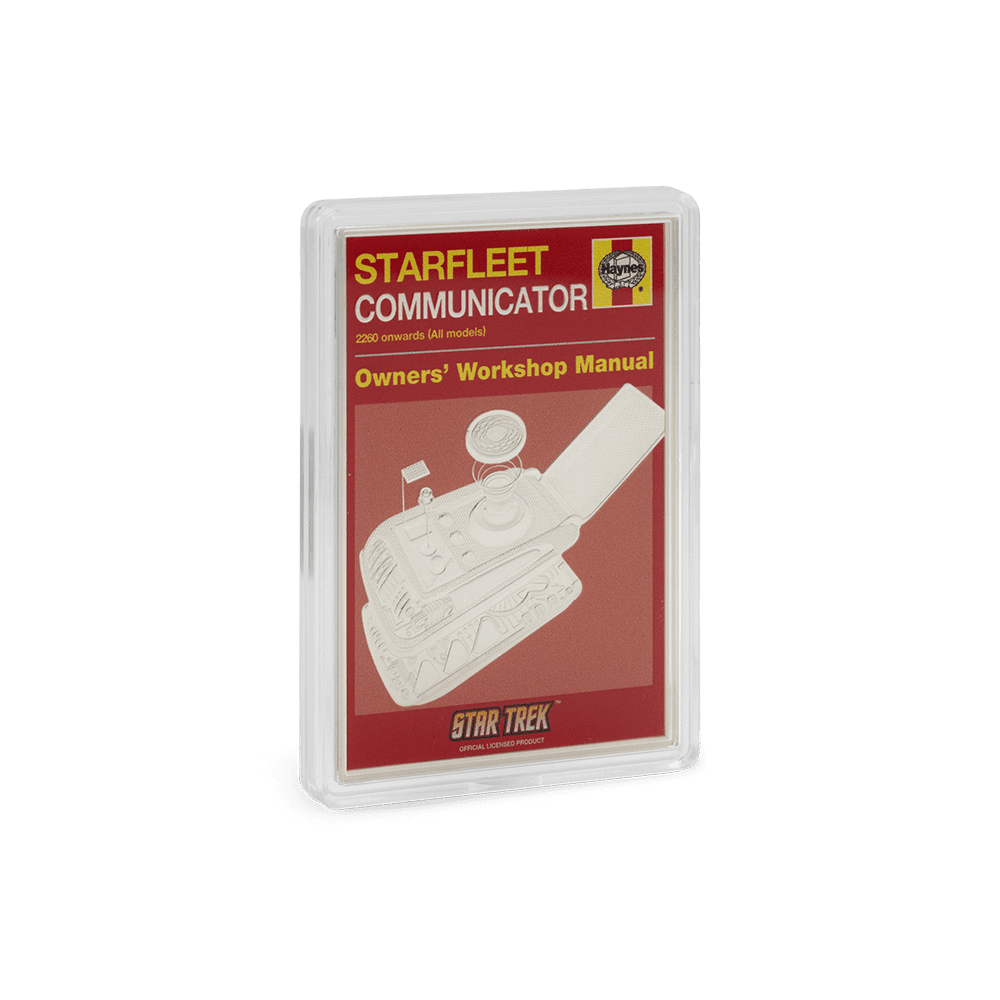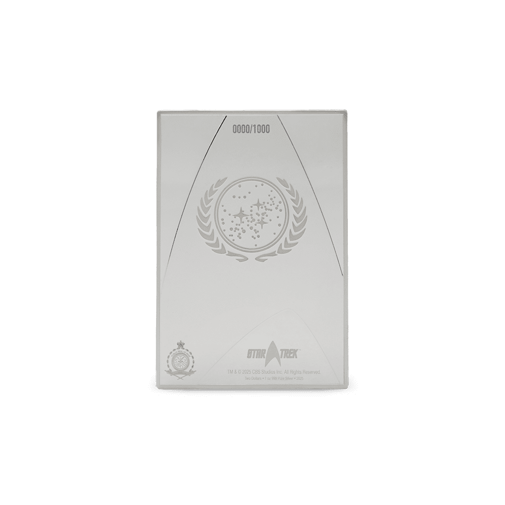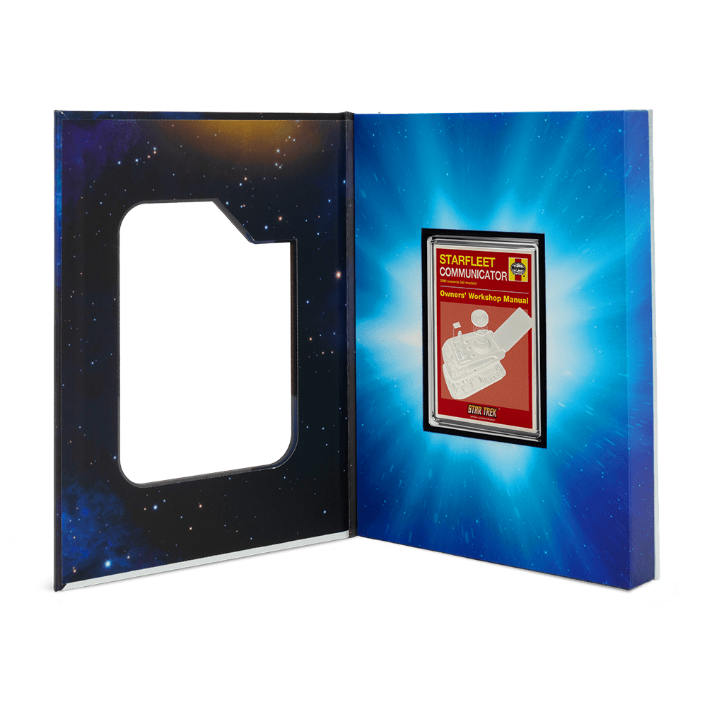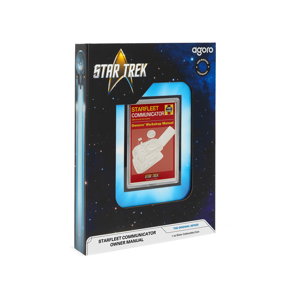 This striking 1oz silver coin celebrates the legendary Starfleet Communicator, capturing the look and legacy of this essential Star Trek icon. The design presents a colourful retro-style manual cover, faithfully engraved with intricate details—including the distinctive communicator device itself. Minted from 999 pure silver and limited to only 1,000 pieces, each coin is individually numbered, officially licensed, and comes in themed Star Trek packaging with the Seal of the United Federation of Planets and a $2 legal tender denomination from Niue. Perfect for collectors or fans, this is the second standout release from the Star Trek Owners’ Workshop Manual series.