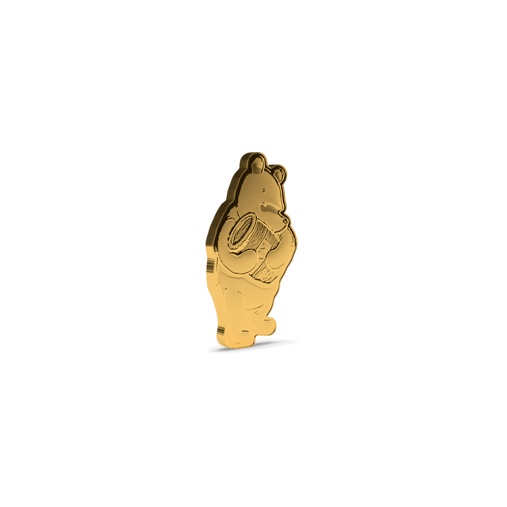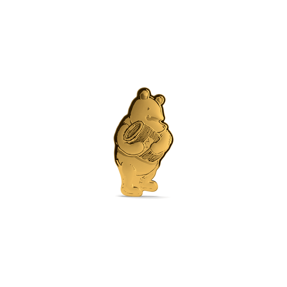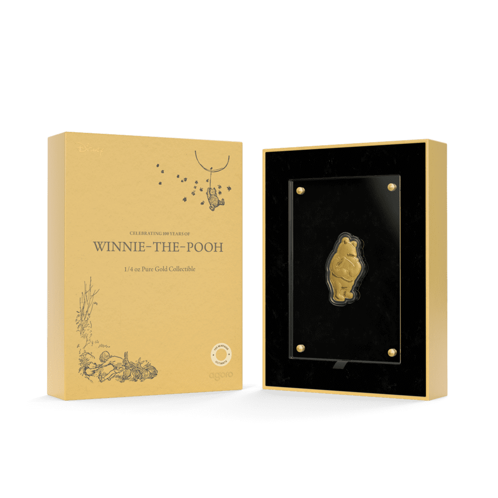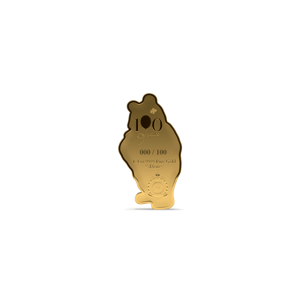 This stunning 1/4oz gold proof coin celebrates 100 years of Winnie the Pooh, crafted in 9999 pure gold for true collectors and Disney fans alike. Featuring Pooh Bear clutching his iconic honey pot, the design brings together a mirror-finish highlight and delicate frosted details, combining proof-quality finesse with storybook charm. With only 100 coins worldwide, its ultra-low mintage ensures both exclusivity and lasting value. Issued as legal tender by Niue and presented in official Winnie the Pooh packaging, this gold collectible is individually numbered, making it an unforgettable centenary release for any Disney, Winnie the Pooh, or gold coin enthusiast.