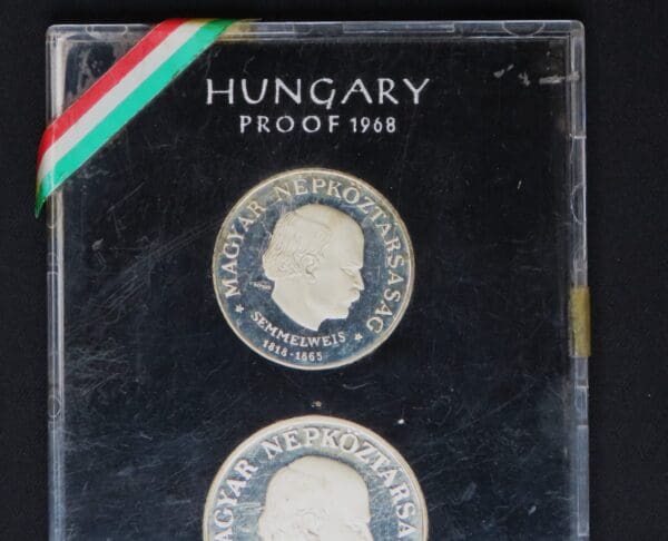 Step into history with this stunning 1968 Hungary Proof Set featuring both 50 and 100 Forint coins, honouring the renowned physician Ignác Semmelweis. Struck in .640 fine silver, these proof coins mark the 150th anniversary of Semmelweis’ birth, famously known as the “Saviour of Mothers”. The gleaming proof finish and the detailed portrait make this Hungary silver proof set a true treasure for collectors and those seeking an elegant silver coin investment.