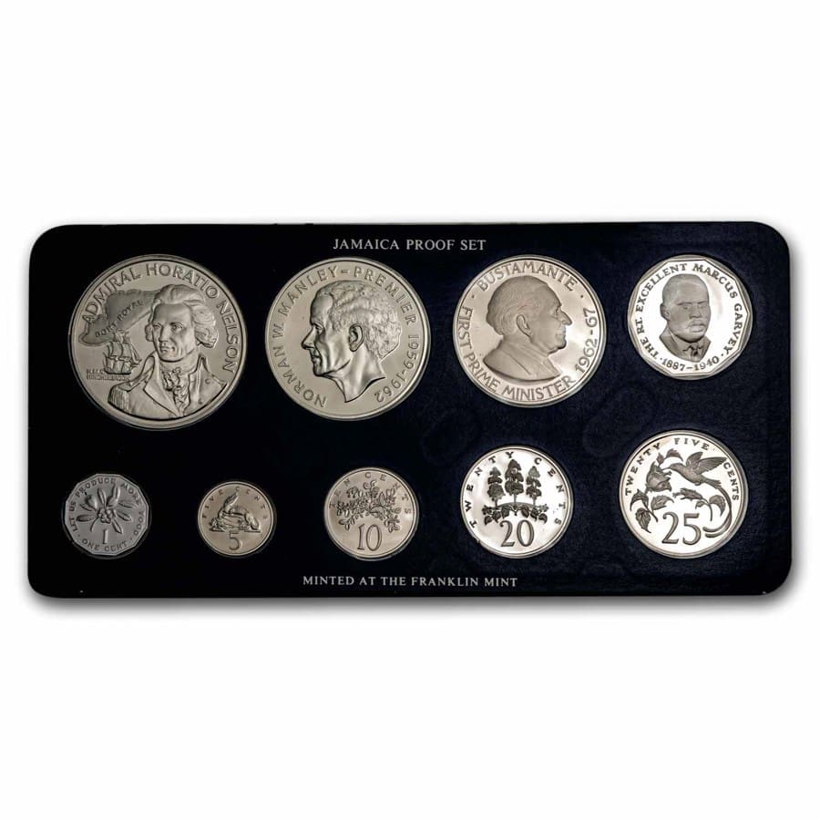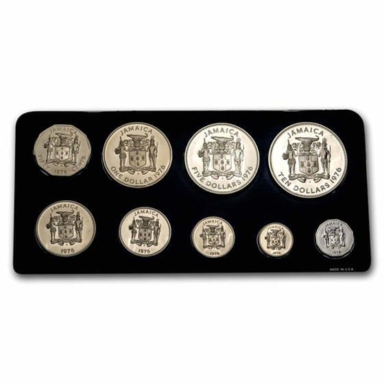 Dive into Jamaican history and artistry with this meticulously crafted 1976 nine-coin proof set. Struck by the renowned Franklin Mint, each brilliant coin proudly displays the distinctive Jamaican coat of arms on the obverse, celebrating the nation’s rich culture. The set includes high-purity silver in both the five and ten dollar denominations, making it a treasured choice for collectors seeking world coins with genuine silver content and distinctive designs.