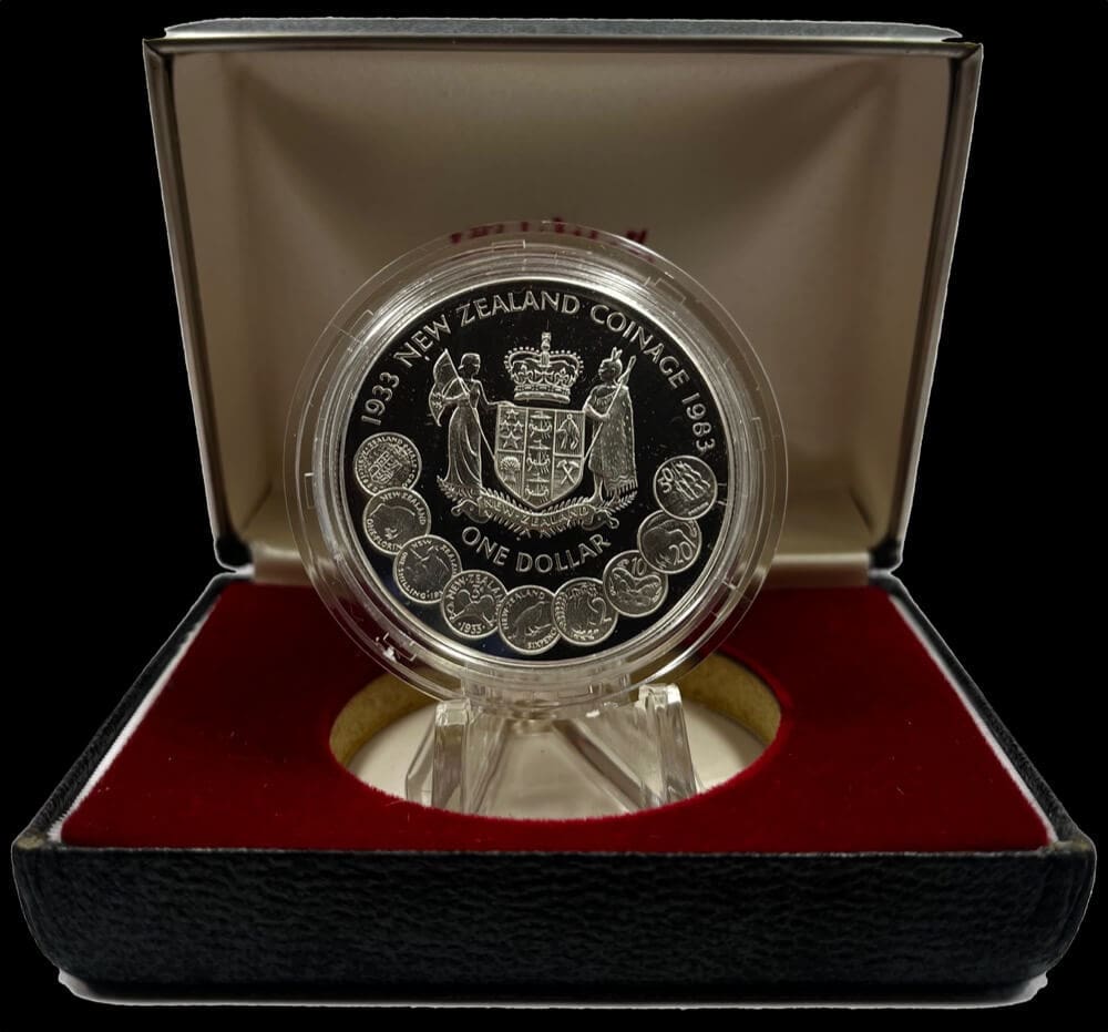 Dive into the heritage of New Zealand coinage with this striking collectable, minted in 1983 to honour the 50th anniversary of New Zealand’s decimal and pre-decimal coins. Crafted in .925 sterling silver by the esteemed Royal Mint, this proof dollar showcases a detailed design featuring beloved classics like the half crown, florin, shilling, and more, perfectly mirrored by their decimal-era successors.