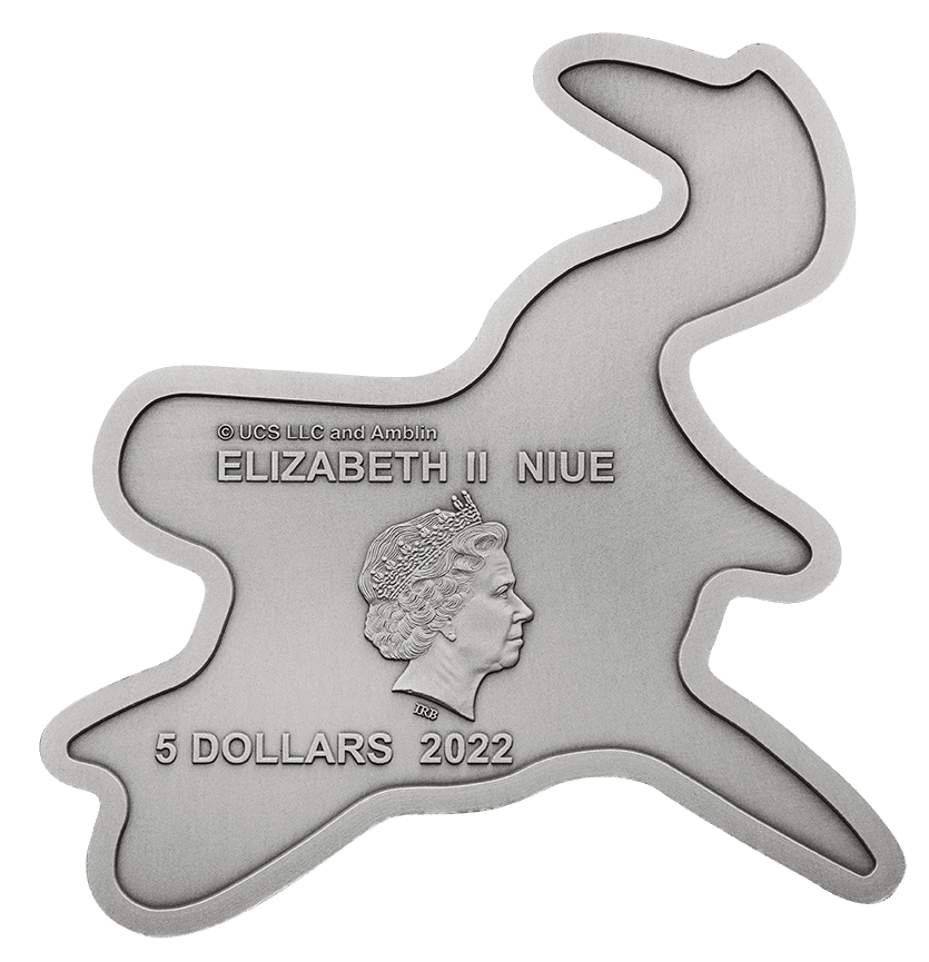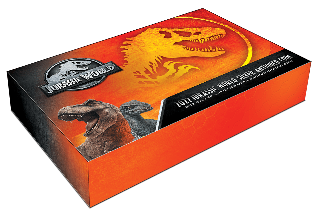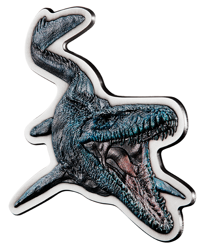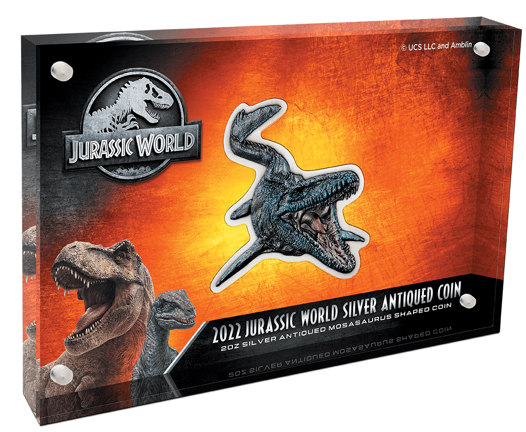 Step into the prehistoric world with this 2022 $5 Jurassic World 2oz silver antiqued Mosasaurus shaped coin. Finely crafted in 99.9 percent pure silver, this collectable celebrates the famous blockbuster film series and features a striking, lifelike Mosasaurus design. The unique antiqued finish adds character and texture, while the intricate shaping brings this legendary marine reptile to life in vivid detail. Supplied in eye-catching, themed acrylic packaging, this issue is a standout piece for any coin or movie memorabilia collection.