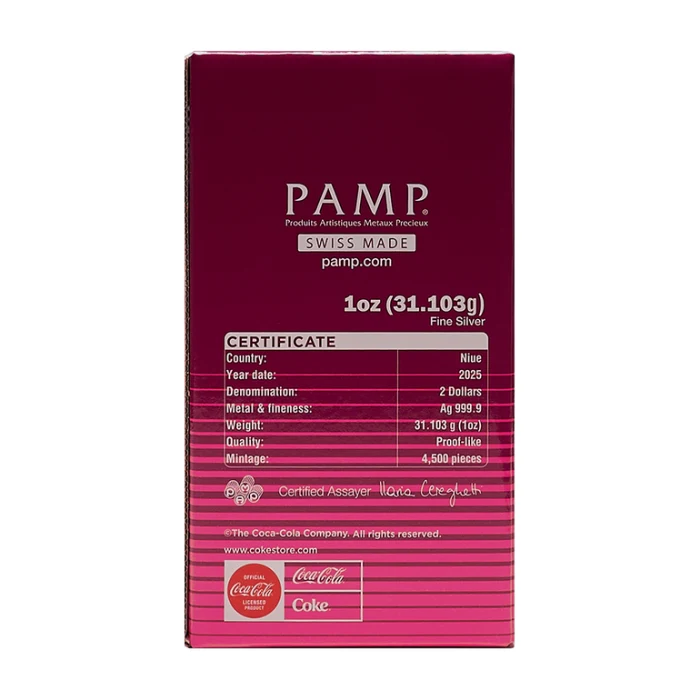 Discover a sensational slice of nostalgia and numismatic brilliance with this officially licensed Cherry Coke anniversary release, crafted in .9999 fine silver and shaped perfectly like the legendary can that changed soda history. Detailed in vivid colour, this 2025 one ounce coin celebrates forty years since the delicious Cherry Coke launched, and features both proof-like prestige and exclusive worldwide mintage – only 4,500 coins exist.