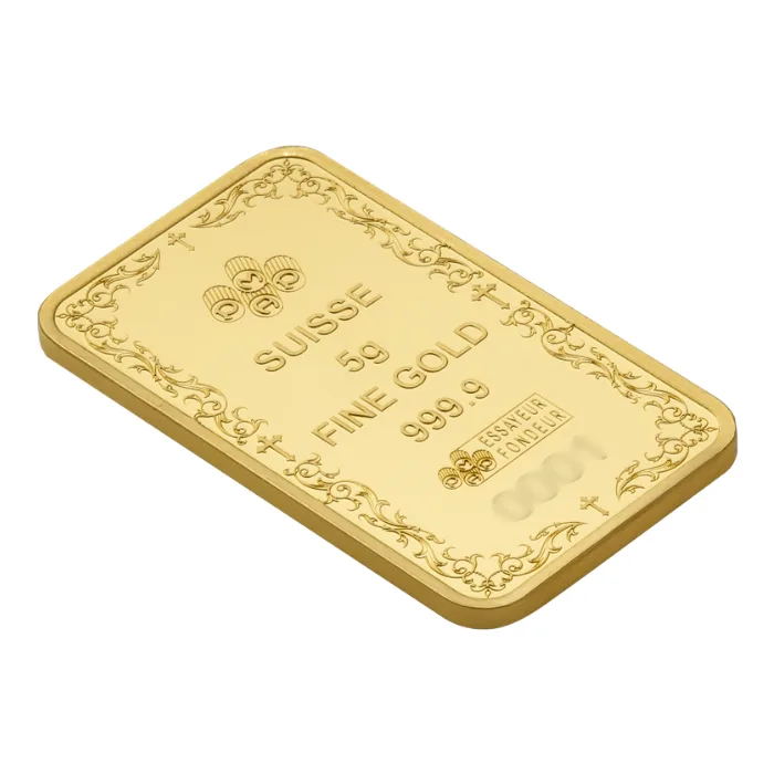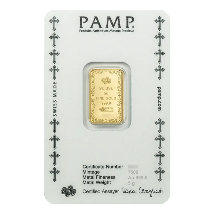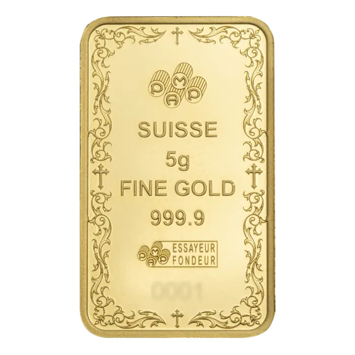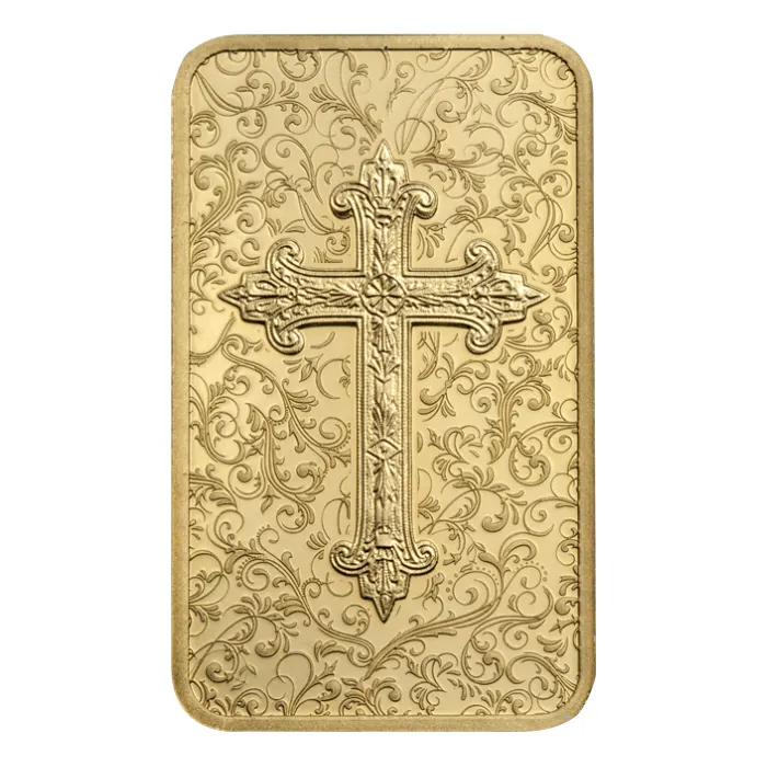Experience a blend of faith and fine artistry with this 5 gram Pamp Suisse Christian Cross .9999 gold bar. Strikingly designed by renowned PAMP Suisse, the proof-like finish highlights the central Christian cross, symbolising hope, sacrifice, and devotion. Each bar contains 5 grams of highly pure .9999 gold, making it a cherished addition for collectors and those who value spiritual themes.