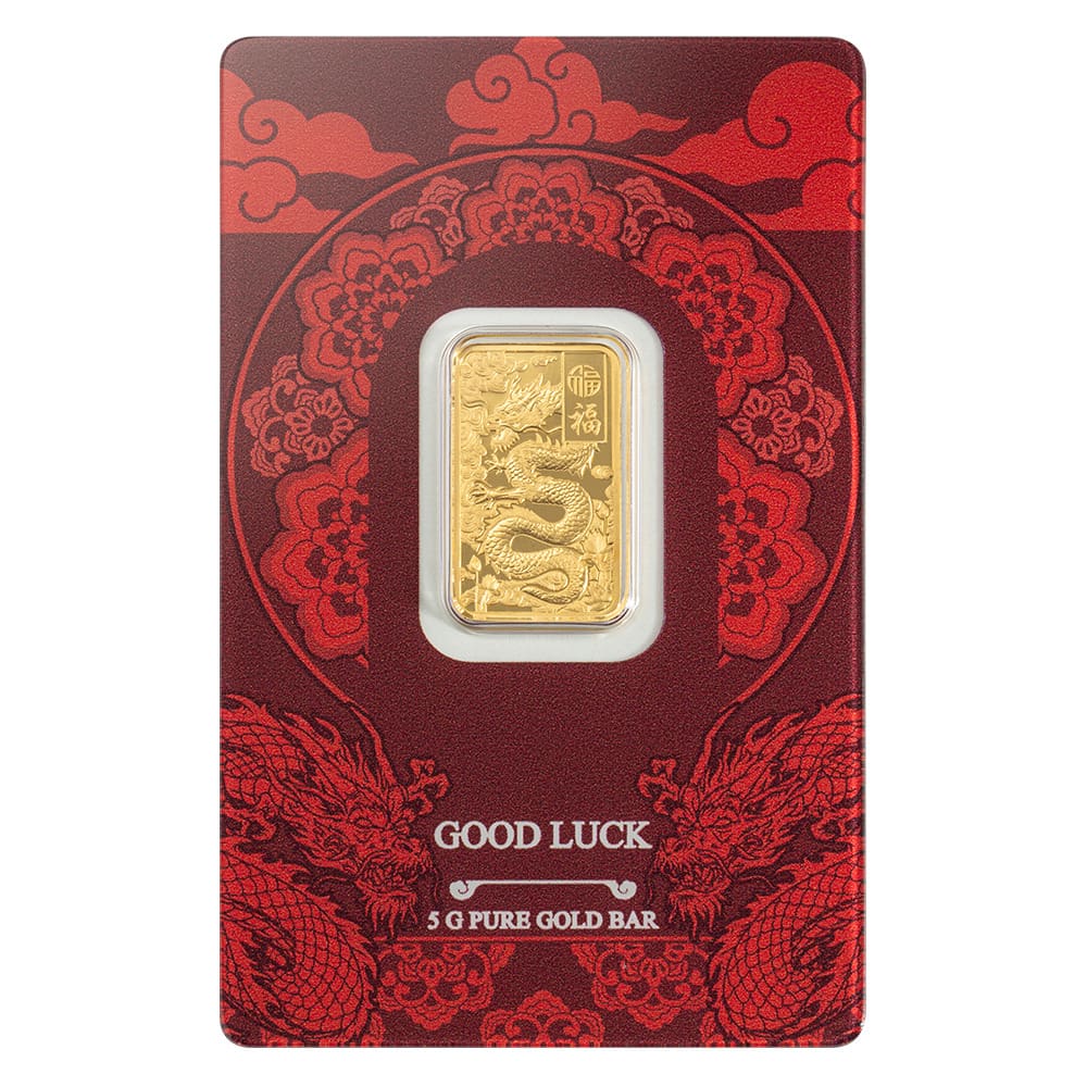 Celebrate the revered Yellow Dragon with this 5g Pamp Suisse .9999 gold prooflike bar. Recognised as a bringer of prosperity, luck, and powerful leadership, the Yellow Dragon is a deeply rooted emblem in Chinese culture. Struck in fine gold, each bar carries exceptional artistry and is secured in a CertiPAMP card with a vibrant gift sleeve for safe presentation. With a strict mintage of just 7,000 pieces worldwide, this Good Luck Yellow Dragon gold bar is both a valuable investment and a meaningful keepsake.