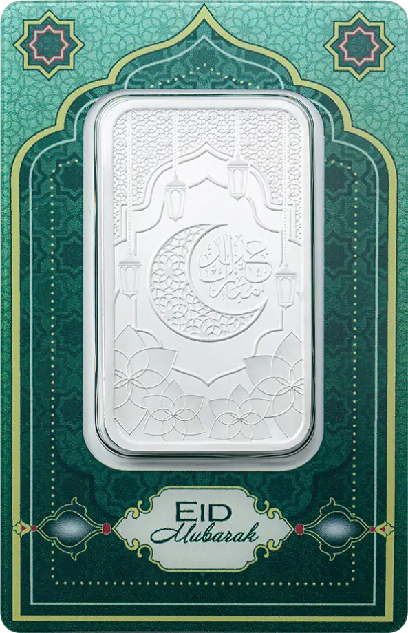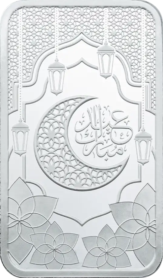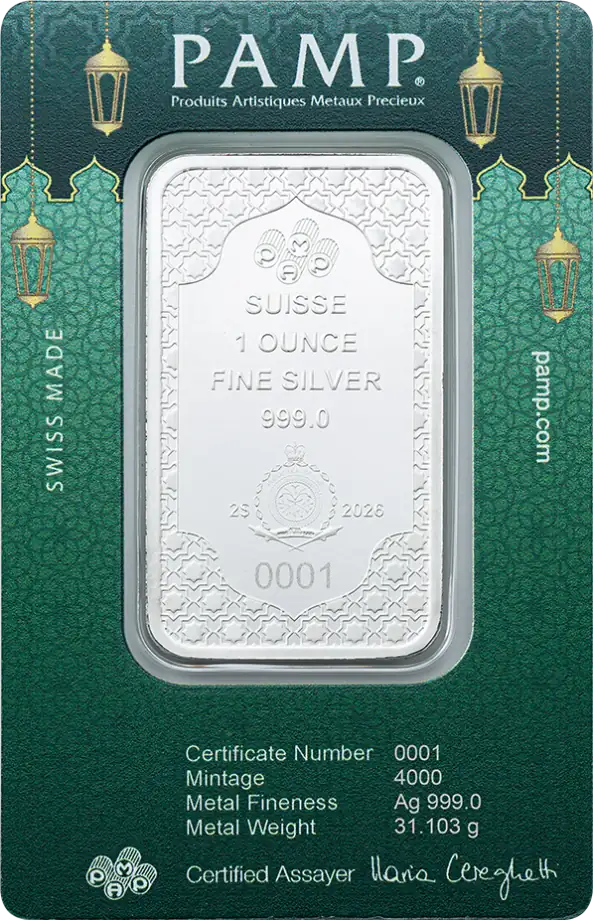 The Eid Mubarak 1oz Silver PAMP Prooflike Bar pairs one troy ounce (31.1035g) of 999 fine silver with a polished, prooflike presentation and a celebratory Eid design. It’s a clean pick for buyers who want recognised Swiss bullion with extra visual appeal—either for gifting or for stacking in a widely traded weight.