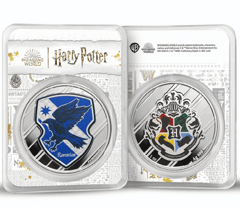 Immerse yourself in the enchanting world of Hogwarts with this officially licensed 2025 silver coin, showcasing Ravenclaw’s iconic blue and silver crest and majestic eagle. Struck from 1oz of .999 fine silver and finished with dazzling colour, this collectible celebrates intellect, wisdom and individuality — perfect for fans who value knowledge and imagination. Admire the detailed artistry backed by a brilliant proof-like shine, ensuring both eye-catching display and timeless value.