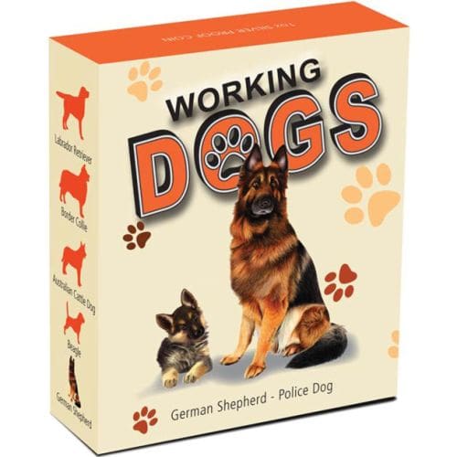 Celebrate the intelligence and dedication of the German Shepherd, an iconic police dog, with this Tuvalu $1 proof coin. Struck from 1oz of pure silver, the vibrant design features a coloured adult German Shepherd and a playful puppy, set against a backdrop highlighting classic police motifs — including policemen silhouettes, a helicopter and vehicle, and distinctive paw prints. The polished proof finish brings each carefully detailed element to life, making it a standout for dog lovers and Silver coin collectors alike.