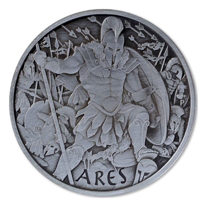 Summon the spirit of ancient Greece to your collection with this striking 1oz 9999 silver piece, crafted in glorious antiqued finish to honour Ares, the mythic God of War. Known for his fierce strength and valour, Ares commands the scene, fully armoured and brandishing his shield on the reverse, all brought to life with meticulous detail and a genuine antique look. This collectable not only celebrates classical mythology but is perfect for those who value premium artistry and historic themes.