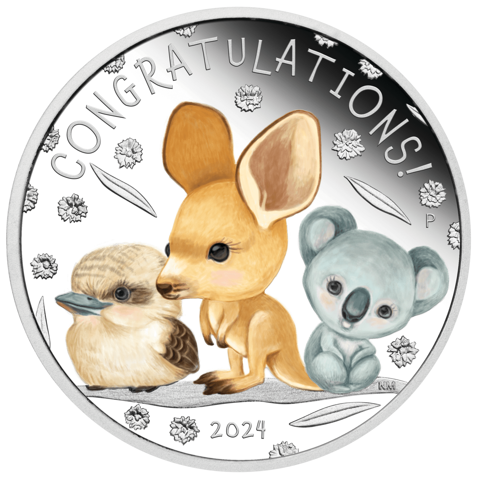 Celebrate a precious moment with this vibrant 2024 $0.50 newborn coin, crafted in half-ounce pure silver. With its elegant proof finish and striking coloured design, it is the perfect gift to mark the birth of a new baby or to start a meaningful collection. The expertly detailed imagery and shimmering silver quality make this coin a wonderful keepsake for parents, family or friends looking for something special.