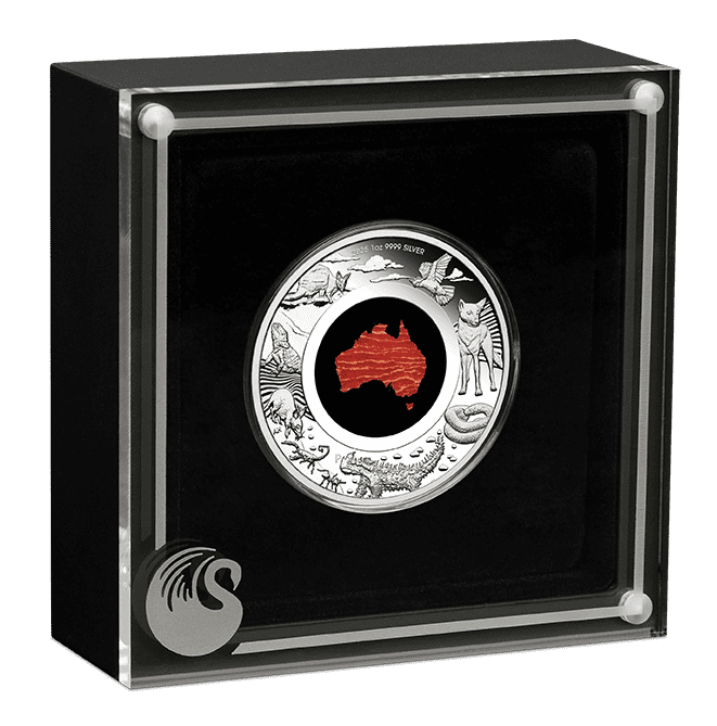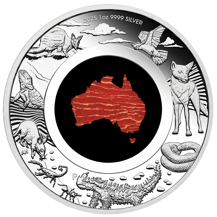 This stunning 1oz silver proof coin continues the Great Southern Land series, celebrating Australia’s unique biodiversity, featuring a vivid display of desert creatures: a cockatoo, dingo, taipan snake, thorny devil, desert ant, scorpion, bilby, bearded dragon and rock wallaby. At its heart, an Australia-shaped insert of genuine snakeskin jasper showcases natural red and white bands, making each collectable coin truly one-of-a-kind.