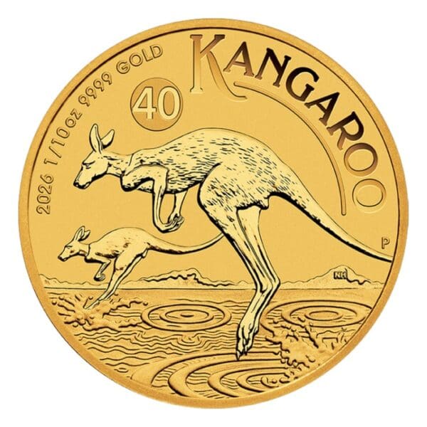 Step into the world of Australian gold with the 2026 1/10 oz Kangaroo Coin, crafted from .9999 fine gold and boasting brilliant uncirculated quality for investment and lasting beauty. The reverse design by Neil Hollis features two dynamic kangaroos leaping through water, surrounded by serene mountain ranges — a perfect reflection of Australia’s spirit and landscape. Celebrating the 40th anniversary of the Australian Nugget series, this release is graced with a discreet ‘40’ privy mark and the signature ‘P’ mark from The Perth Mint, cementing its collector appeal.